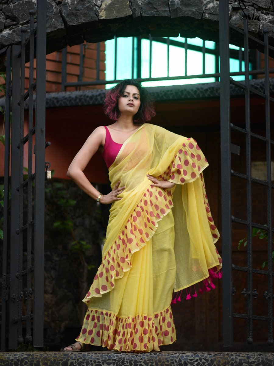 Ruffles are the perfect addition to the incredibly soft and light made-in-heaven Mul fabric. These pretty ruffle sarees are an amazing addition to your wardrobe because they offer the perfect mix of elegance and spunk.