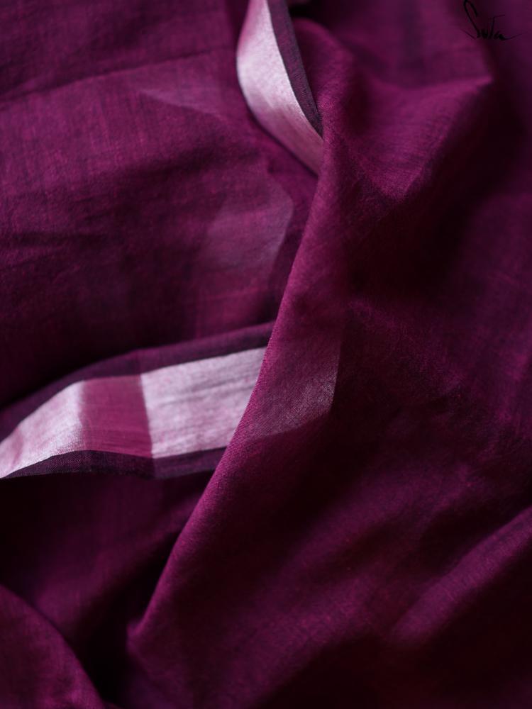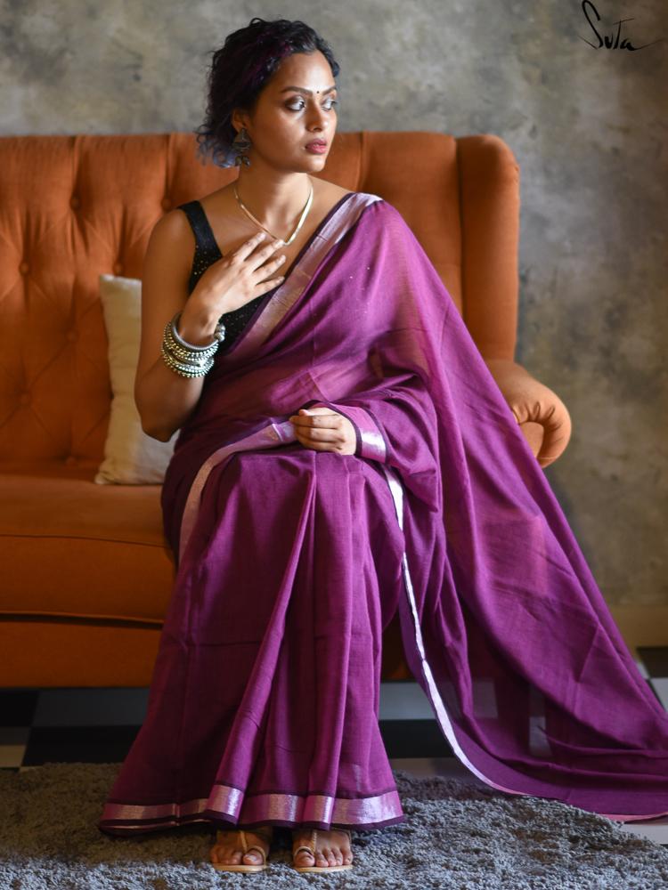 This is a purple-coloured handloom made-in-heaven mul cotton saree with zari in the border. And, it embraces all of you in its fluid, soft drape.