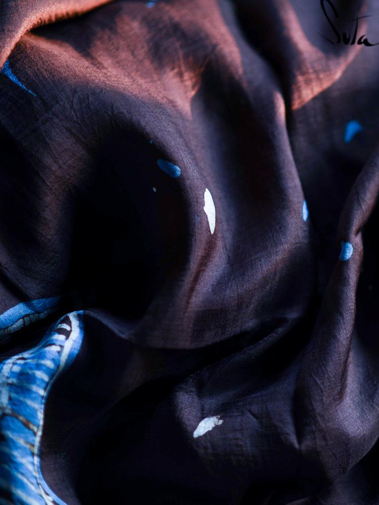 This black-hued handloom mulberry silk saree with free-hand Batik design is simply gorgeous!