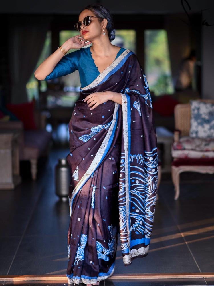 The ancient craft of wax-resist dyeing called Batik adds a timeless charm to this saree. Wax-resist dyeing has been a part of so many ancient civilisations across the world and can be uniquely characterised by the local motifs and designs used. Specifically in India, Batik is said to have over 2000 years of history. Materials such as wax or rice starch was used to create the resistance to dye and thus create the Batik designs. The entire process involves various steps such as drawing the basic pattern, redrawing using wax and then applying the dye.Then, the wax is removed after the fabric dries. This is done multiple times to create various patterns with different colours.The process of dyeing is something that has been passed down by generations of artisans and the stunning designs created by these master craftsmen are timeless.