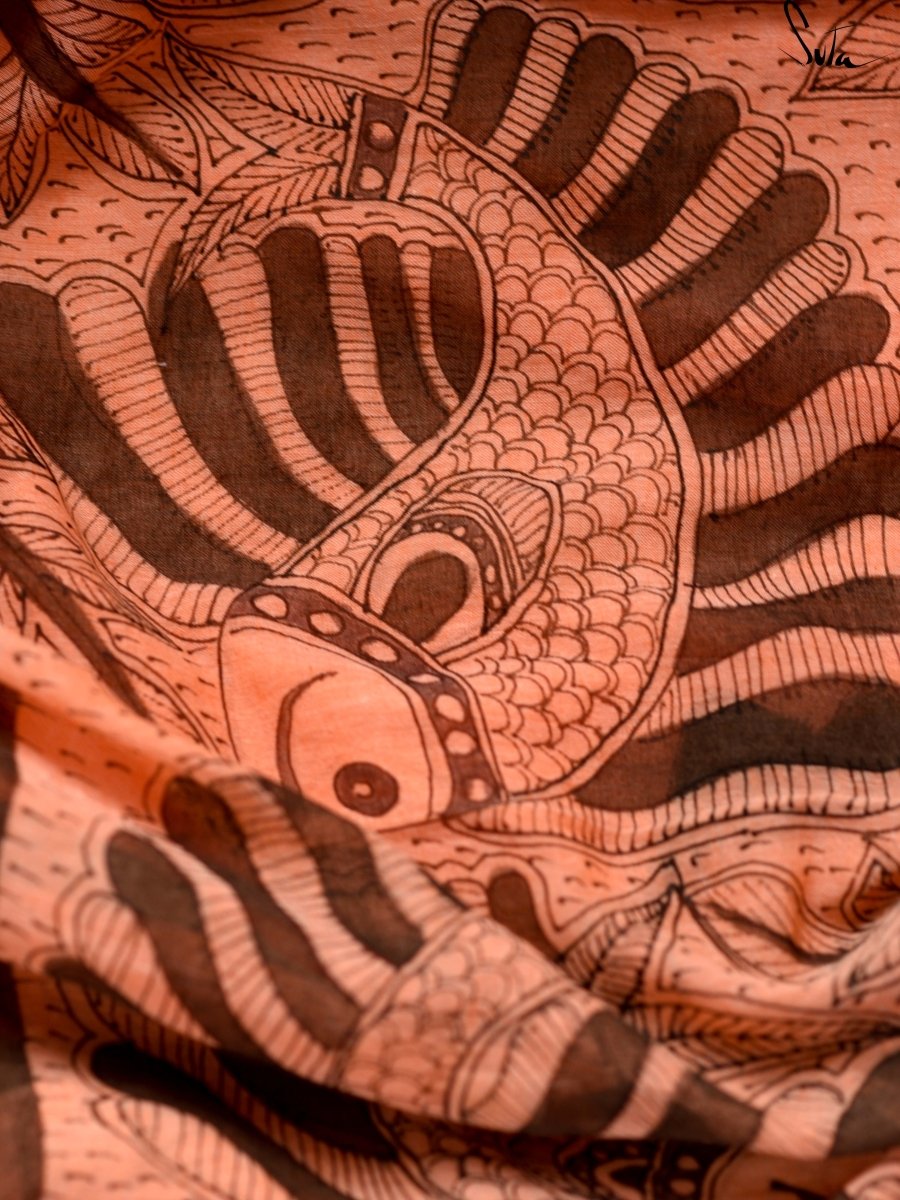 Our artists paint with all their hearts to create the hand-painted sarees. First, the painting is created with a pencil and water colours and once it is finalised, it is made on a live-sized paper and sent to artisans in villages. These artisans keep this as a reference and paint the final painting on the fabric in a free-hand technique. The softest Mul fabric becomes the perfect canvas for this art and these sarees make a statement like no other. There are bound to be some irregularities here and there and no two products will look absolutely the same. This is the beautiful allure of hand-painted art.
