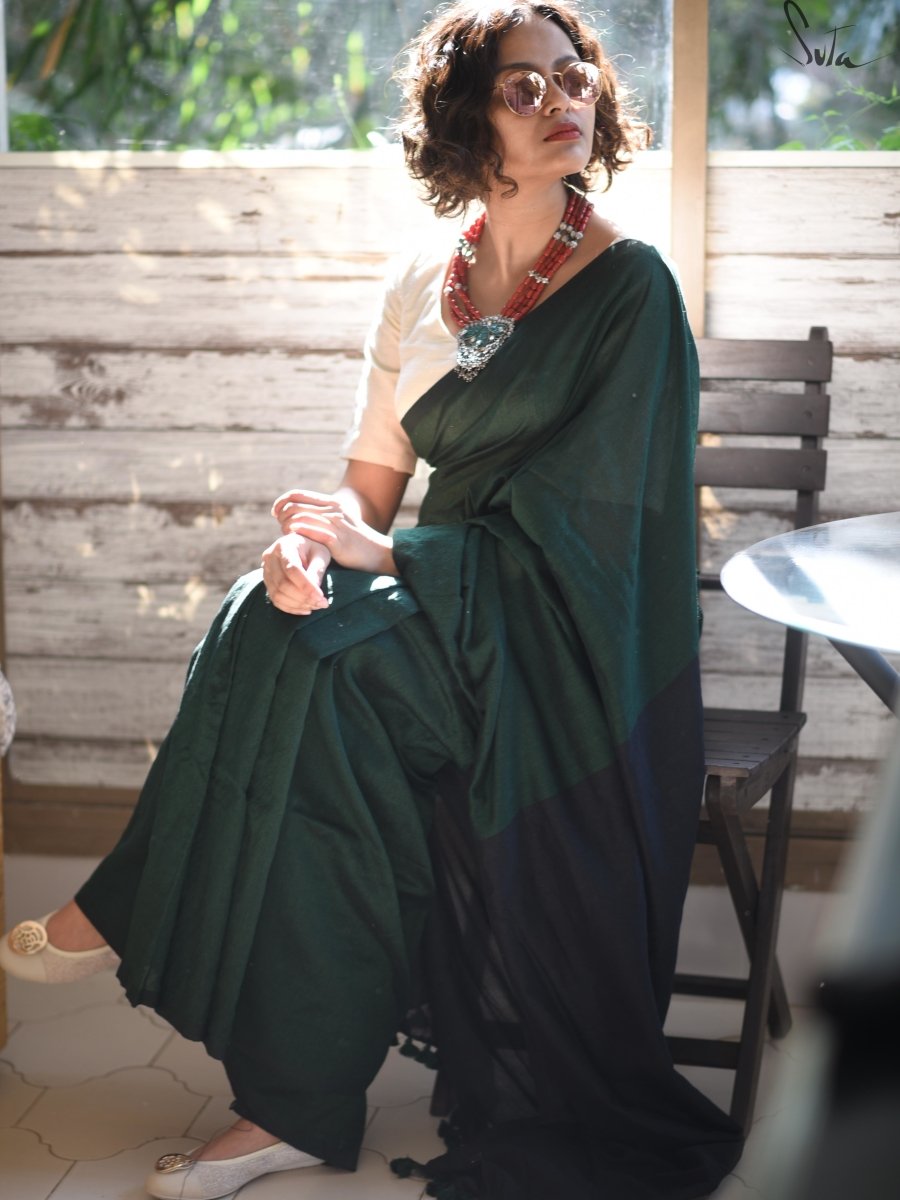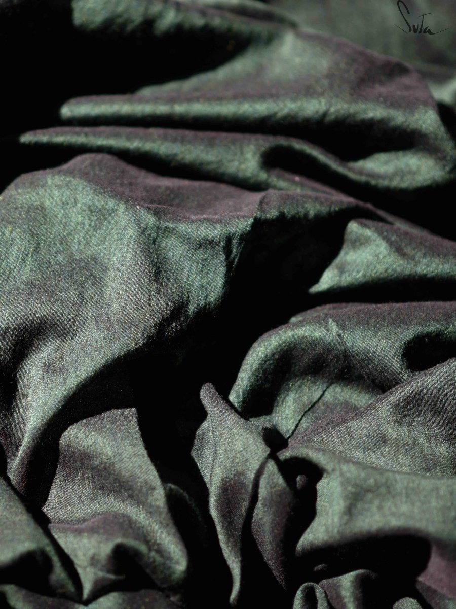This intense dark green and black sheen saree is one that will remain a classic in your wardrobe for its sheer elegance!