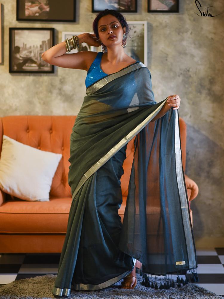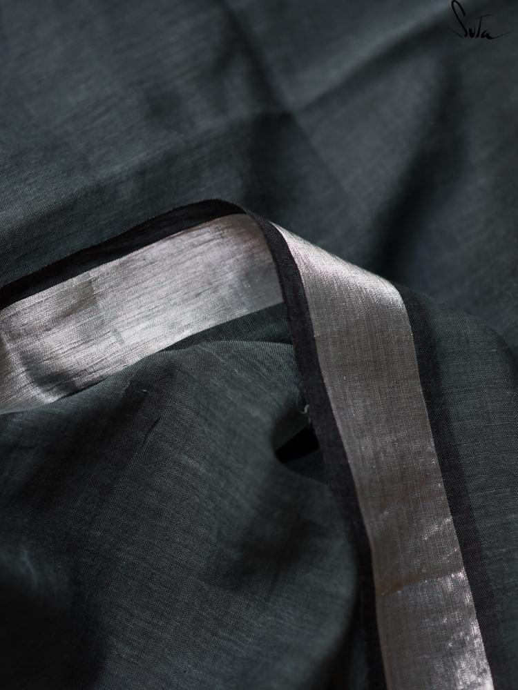 This is a grey-coloured handloom made-in-heaven mul cotton saree with zari in the border. And, it embraces all of you in its fluid, soft drape.