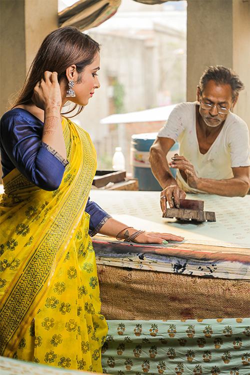 The bright colours of handblock discharge prints are such, you definitely would love to pick more than one. Shop for that perfect shade or pick your all-time favourite. It’s a Silk 5.5 mtr saree drape with exclusive 80 cm blouse piece to go with. 1. Recommended separate wash in cold water with mild detergant only or dryclean. 2. Chances of minor color bleeding on Handblock prints it's a sign of genuiness of prints.