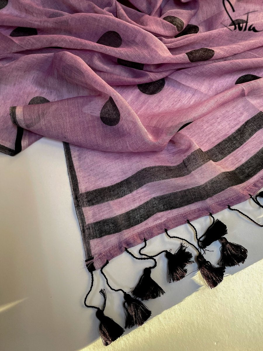 This gorgeous saree in a lavender shade in made-in-heaven mul with screenprinted polka dots is a must-have!