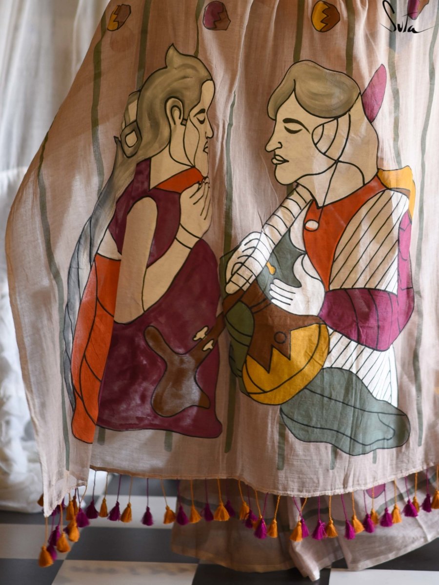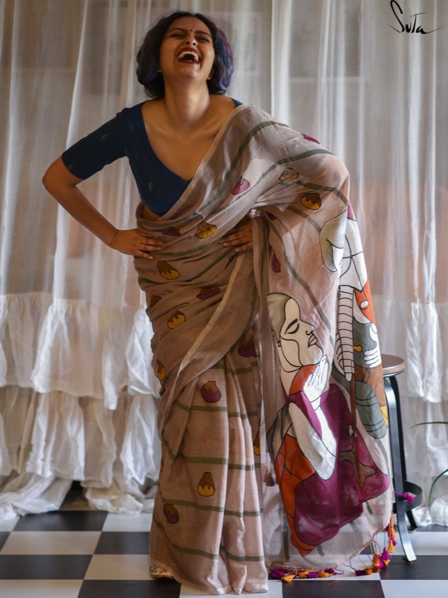 This light-brown hand-painted made-in-heaven mul saree is a must-have! The beautiful artworks on the sarees from this collection are created by Amrit and replicated on our sarees by Suta’s women artisans.