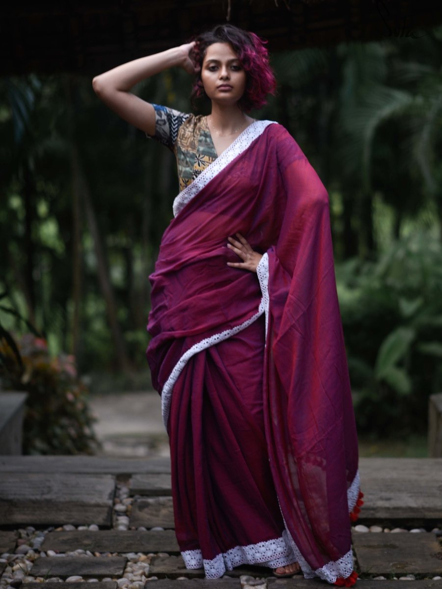 This brilliant pink made in heaven mul cotton saree with lace work is simply stunning!