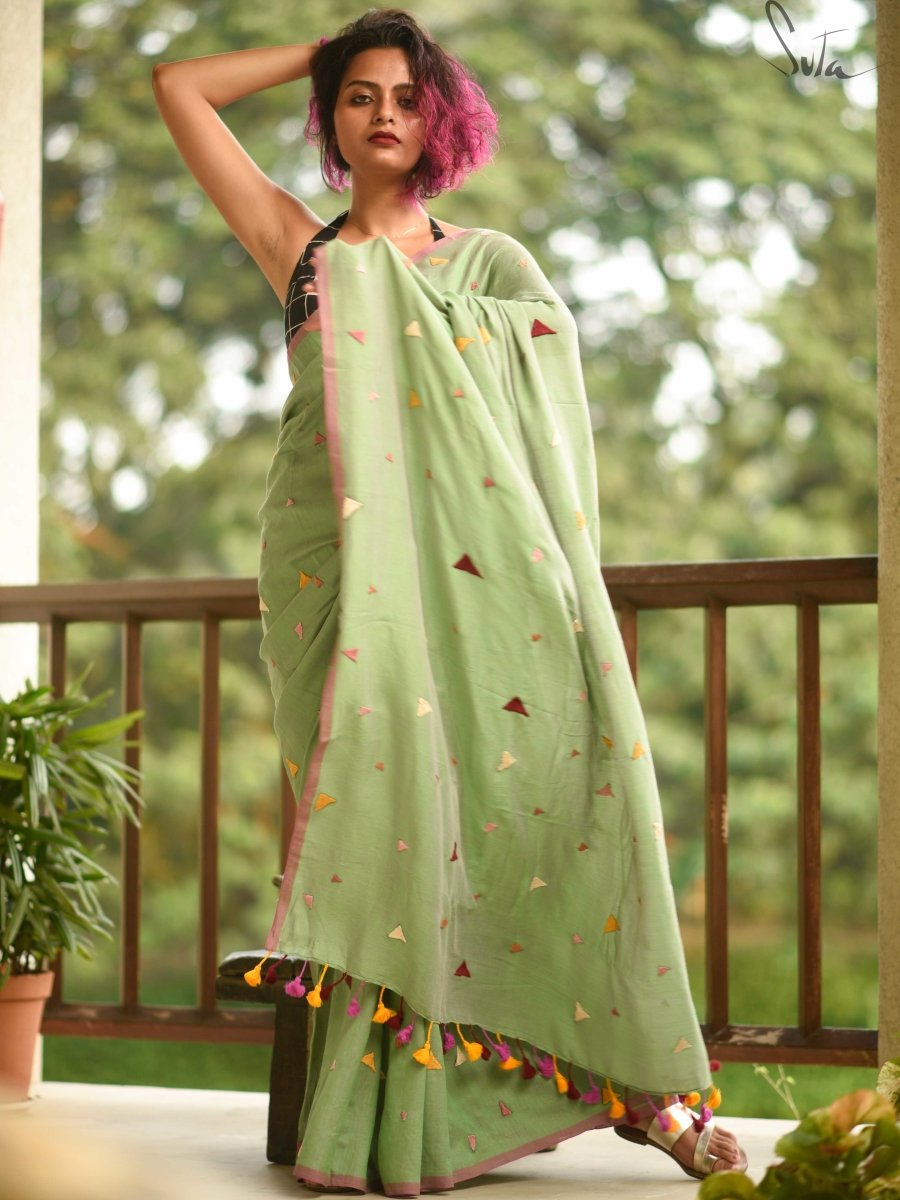 This beautiful saree in green, yellow and pink is a blend of made in heaven mul and modal fabric and has gorgeous embroidery on it!