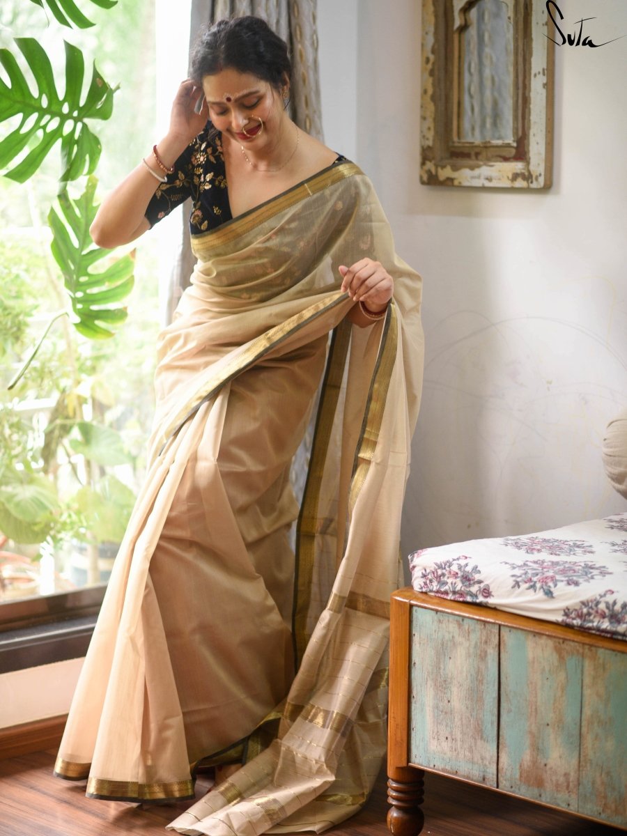 This beige and gold saree in handloom silk cotton with zari border is a vision indeed!
