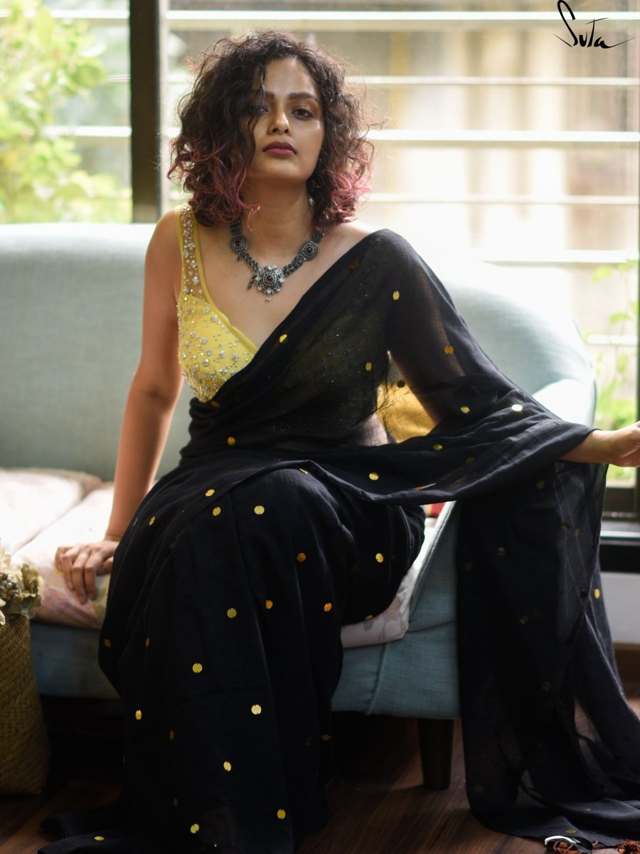 This black made-in-heaven mul saree with glitters is iconic!