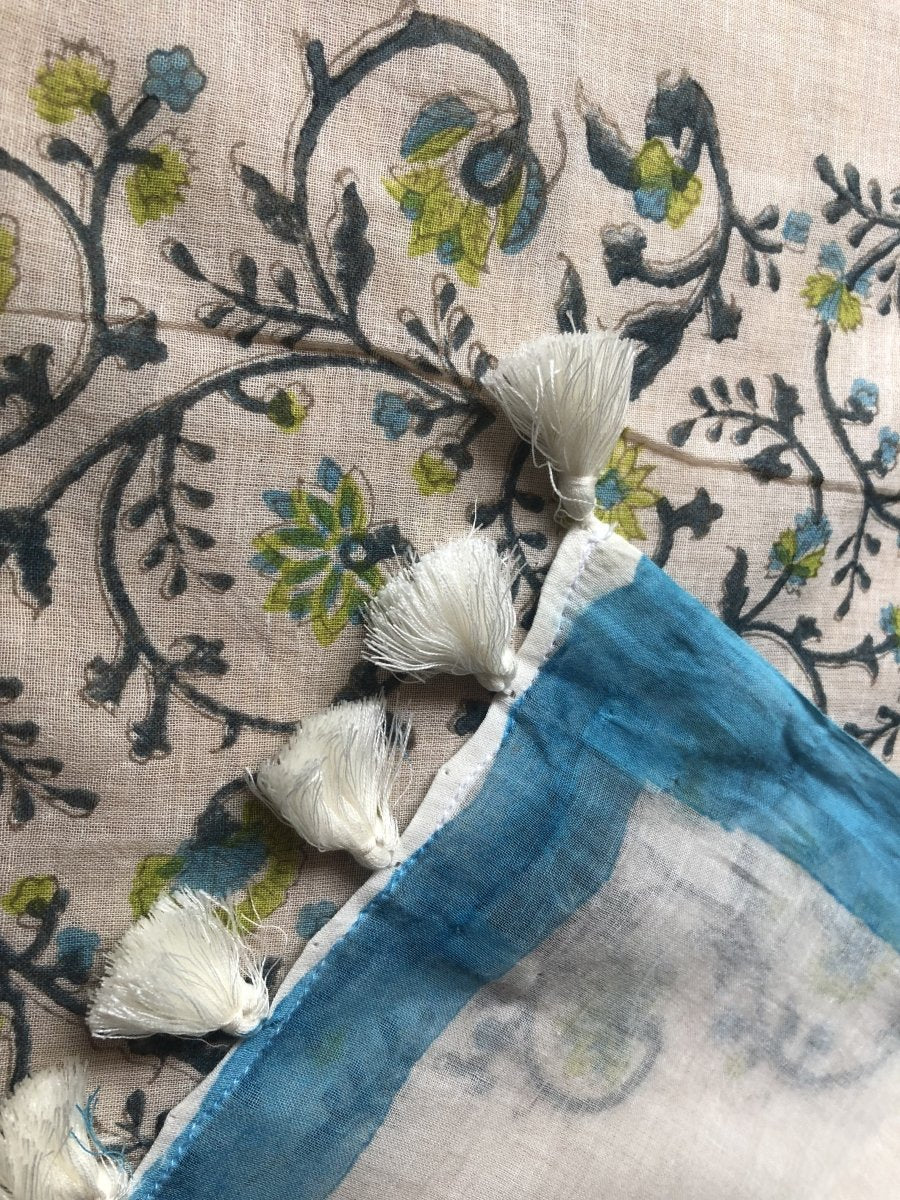 The block-printing on this saree is done on a made-in-heaven mul cotton fabric which is lighter than air and loved by our Suta Queens immensely.