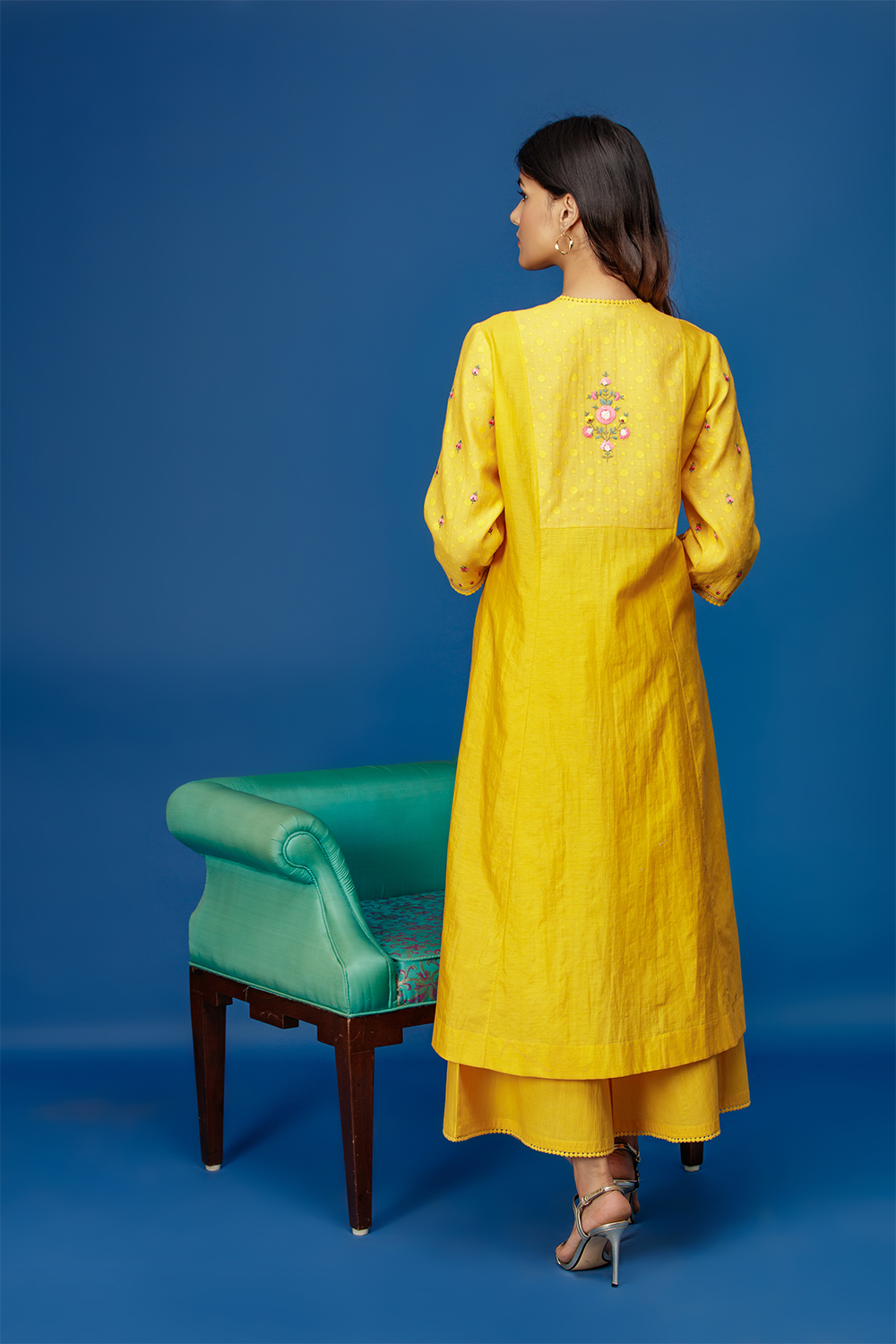 Embroidered Double Layered Kurta With Flared Palazzo. Yellow