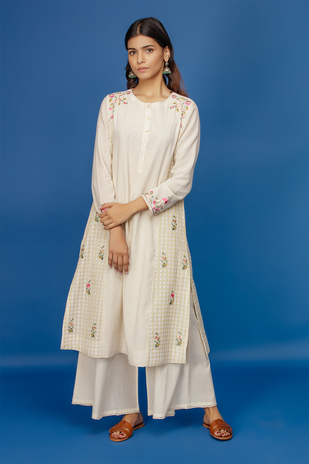 Embroidered Front Placket Kurta With Palazzo. Ivory