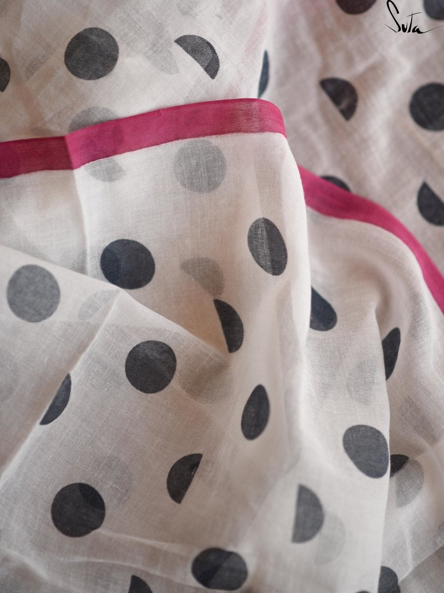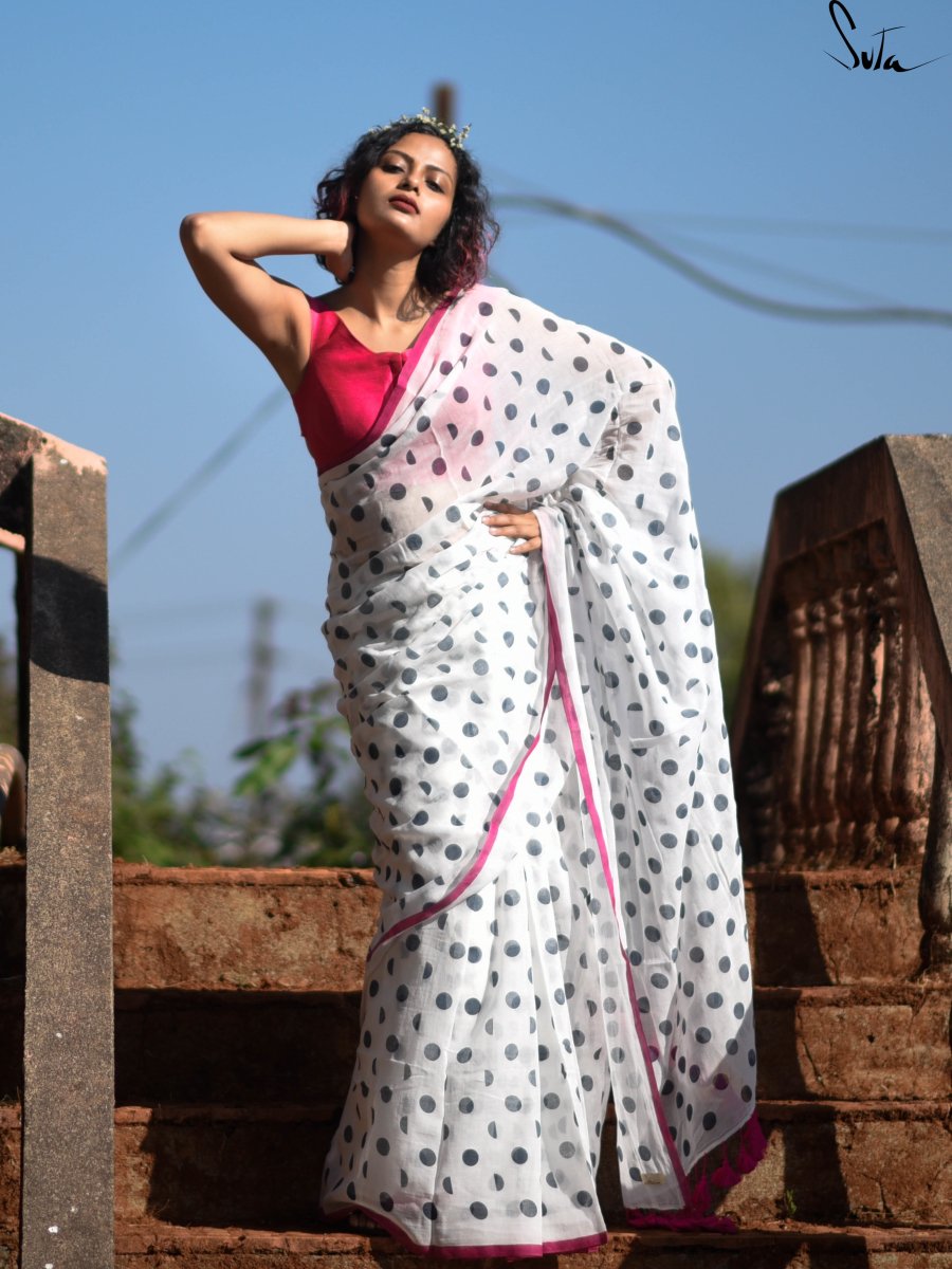 This made in heaven mul saree in white with pink and grey detailing is a must-have!