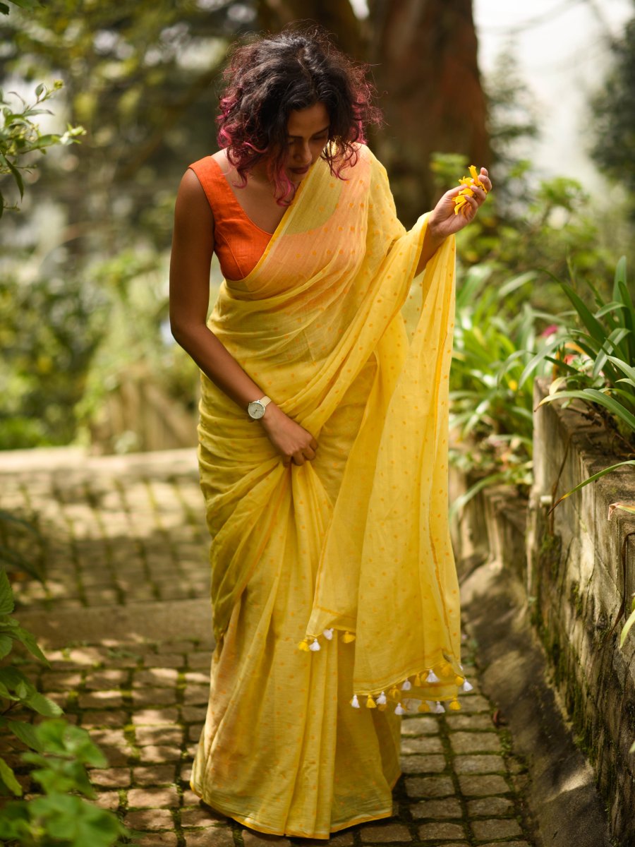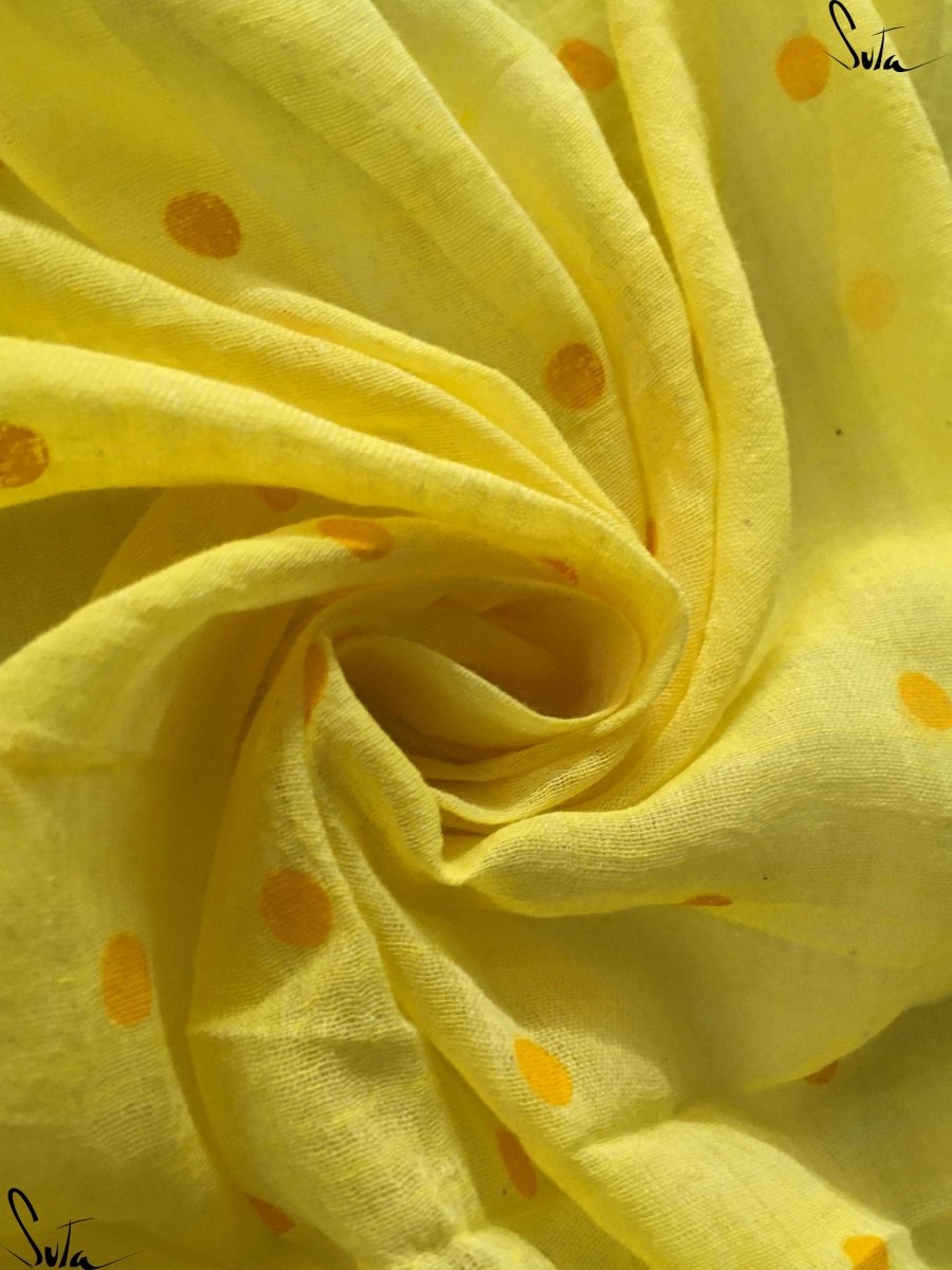 This yellow coloured made-in-heaven mul cotton saree with block printed design is a must-have!
