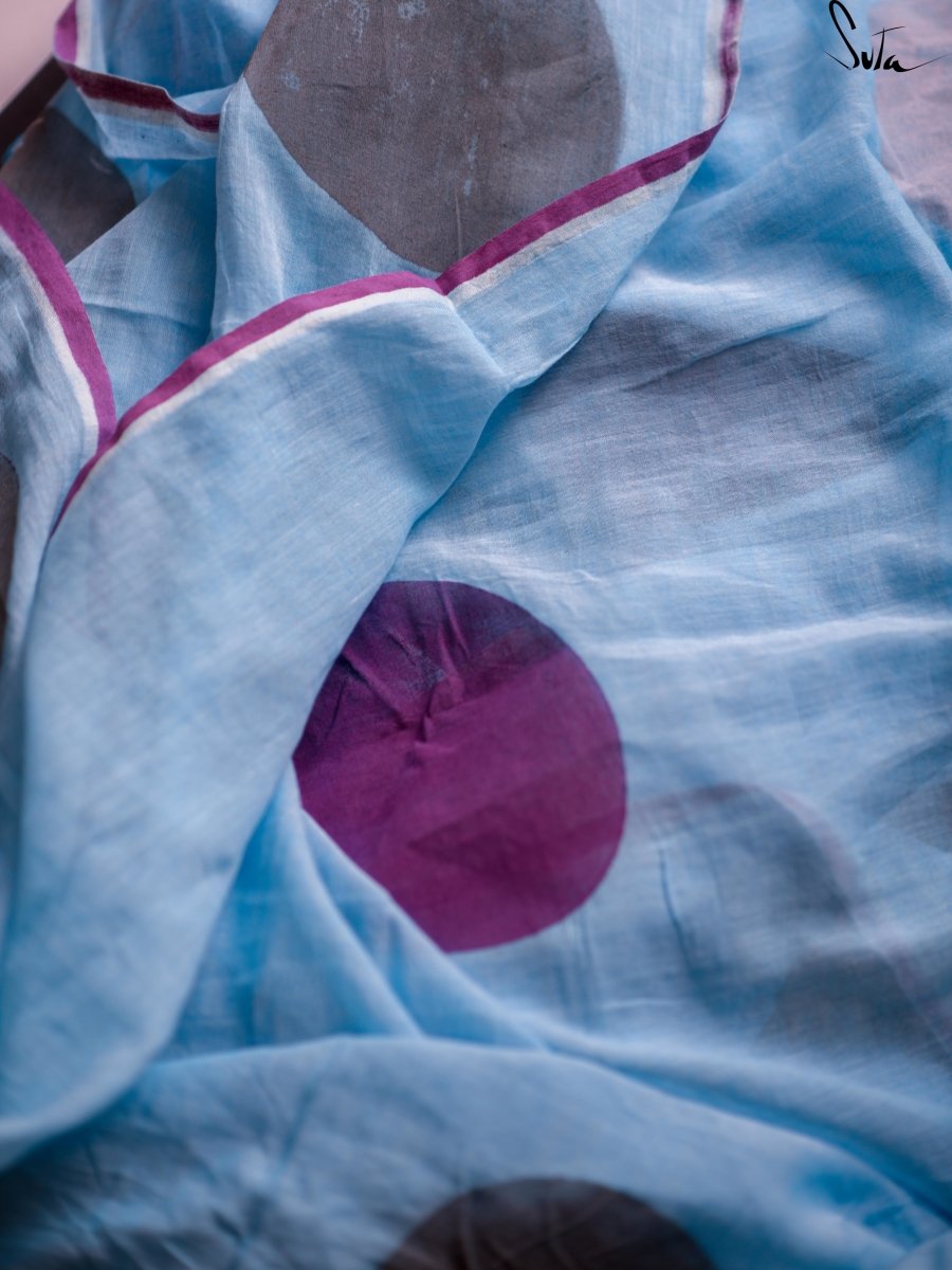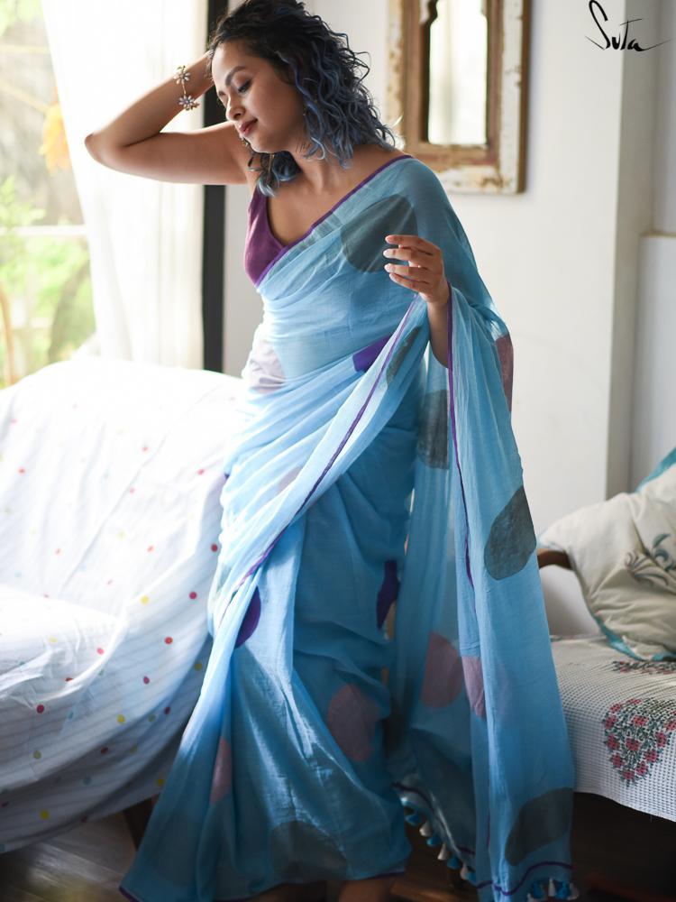This hand block made-in-heaven mul saree in blue, purple and peach hues is simply gorgeous!