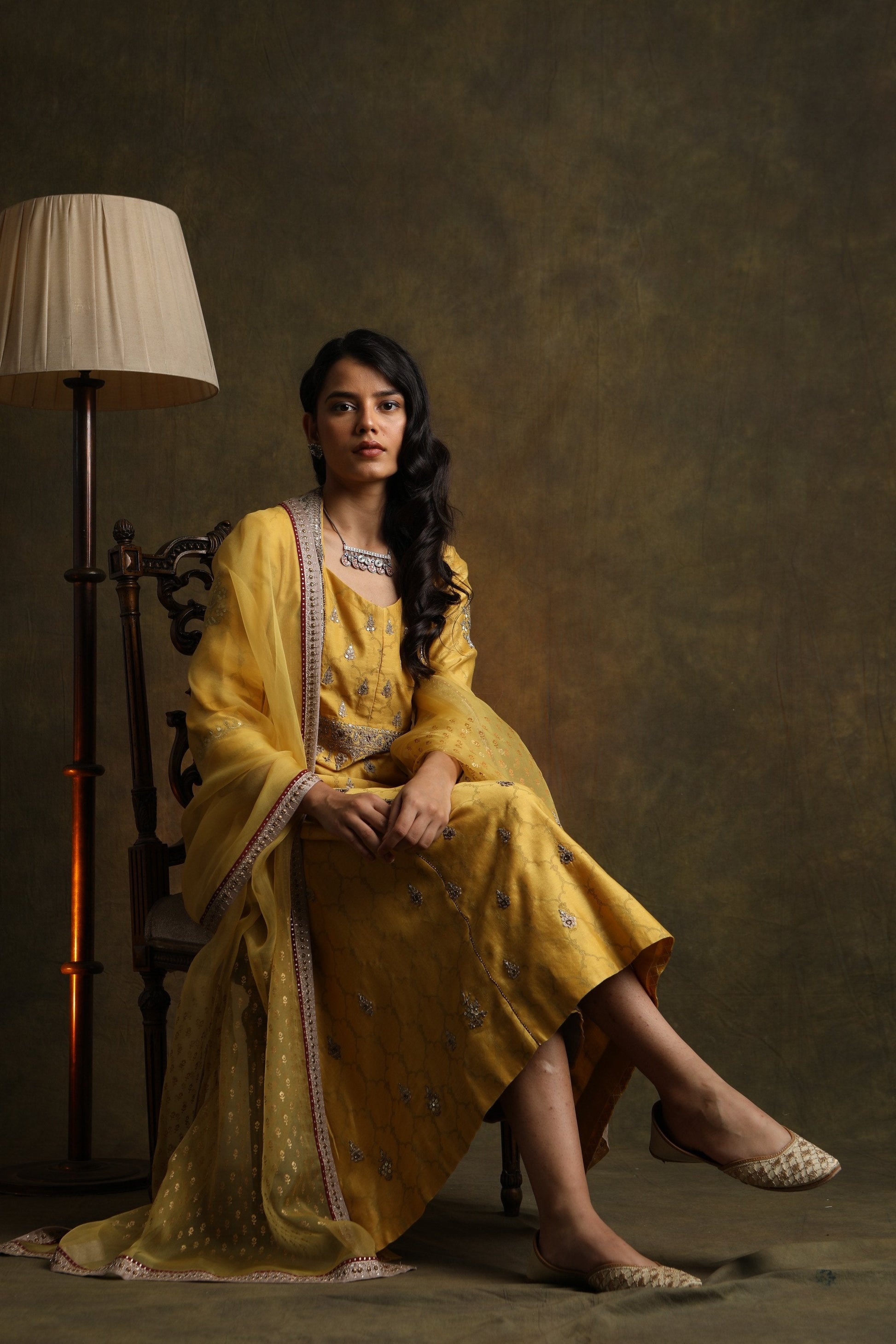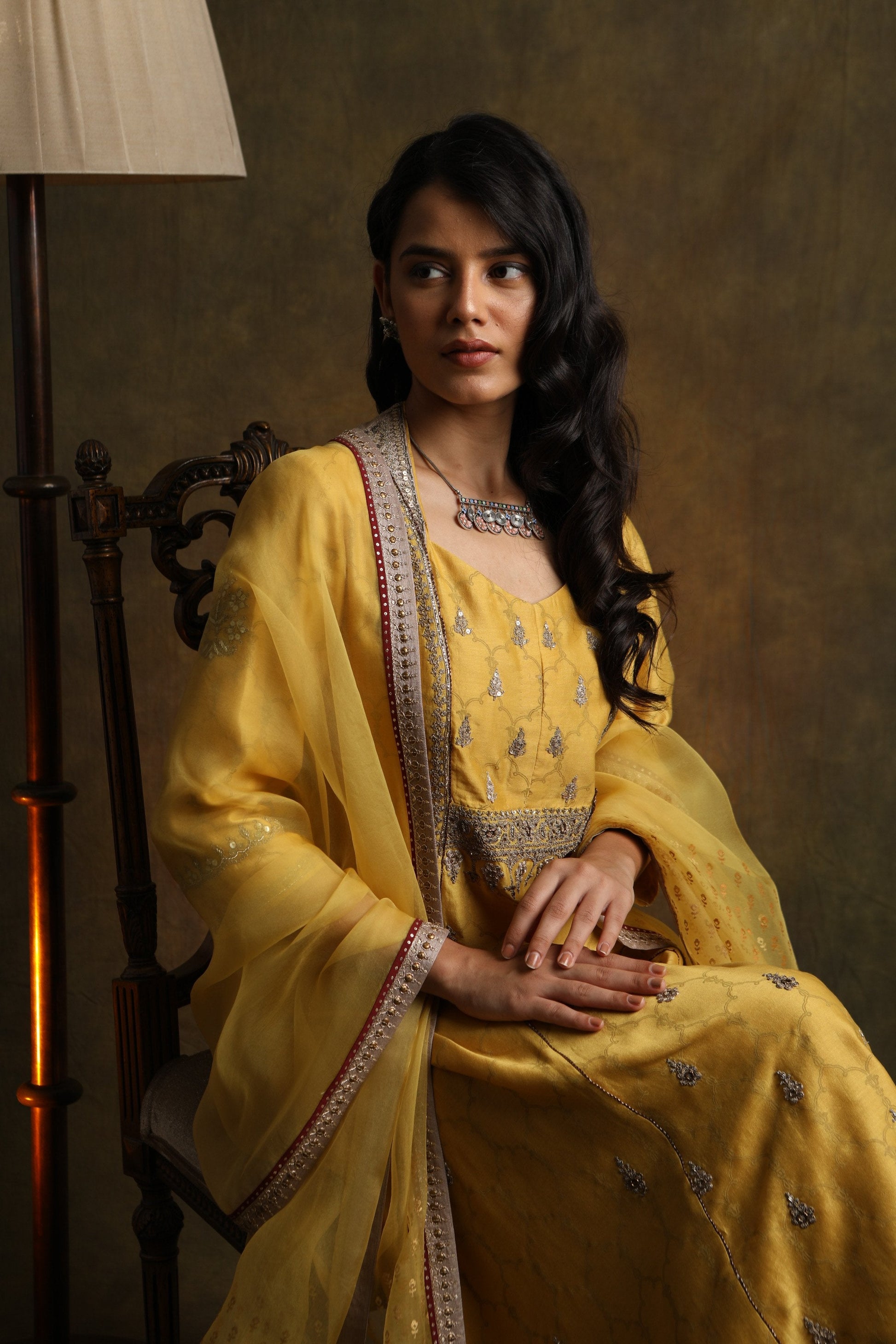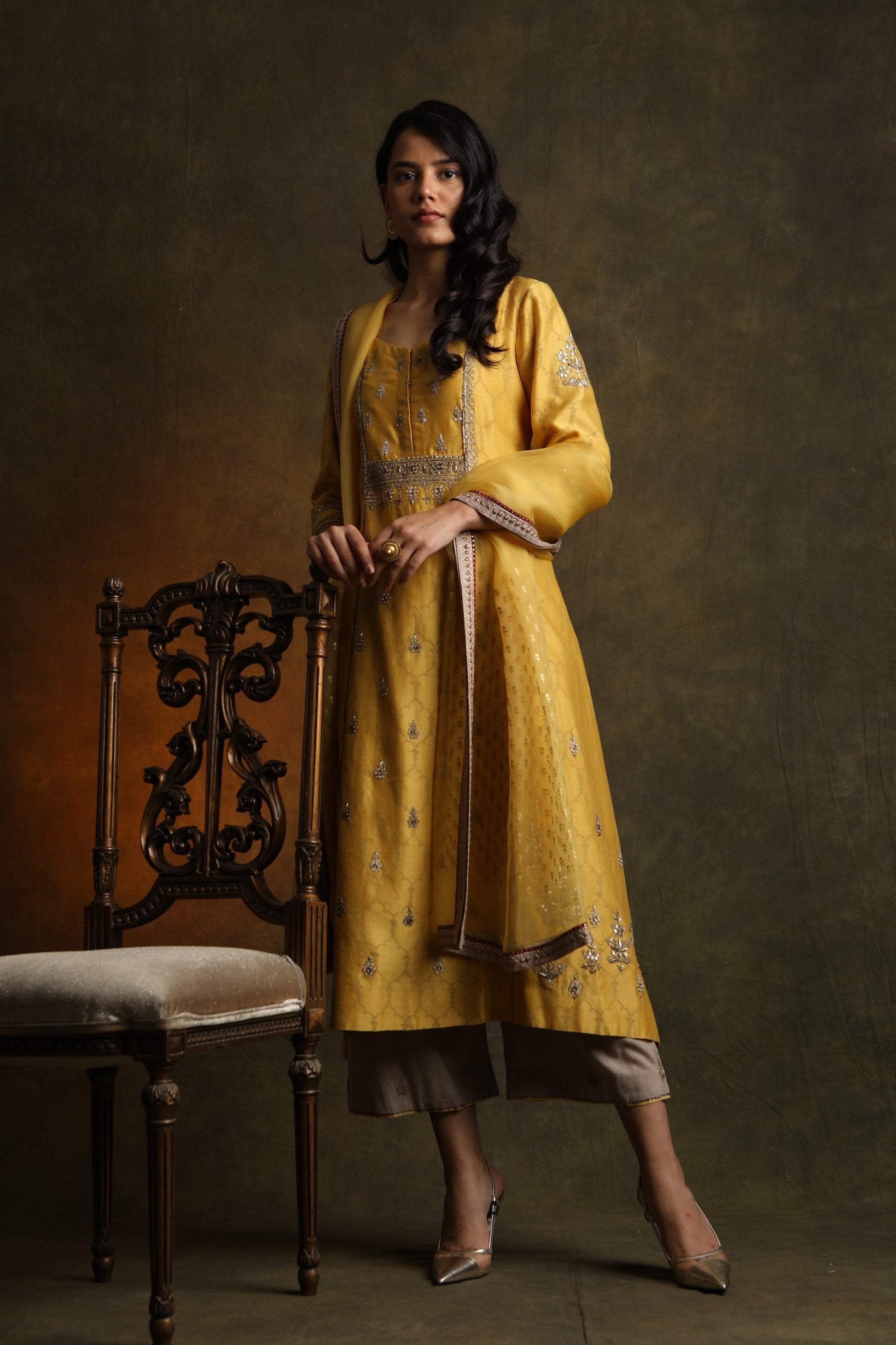 Rich & Elegant Floral Motifs Embroidered & Printed Mustard Chanderi Kurta Comes Along With Embroidered Toosh Cotton Palazzo & Beautifully Printed Matching Organza Dupatta