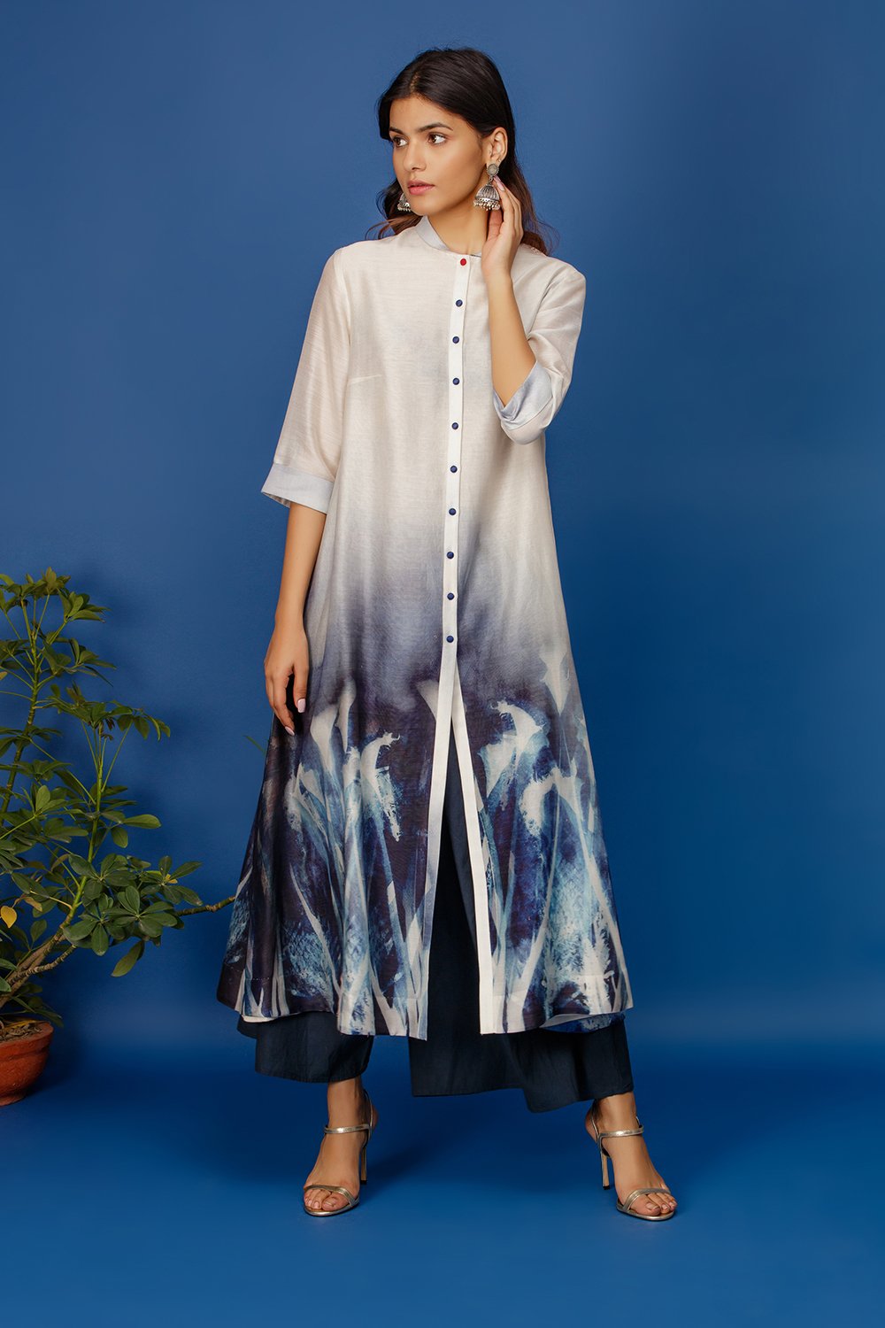 Cyanotype Print Floral Motif Full Length Elegant Kurta, Front Open Placket With Contrast Colour Buttons & A Delicate Flat Collar.