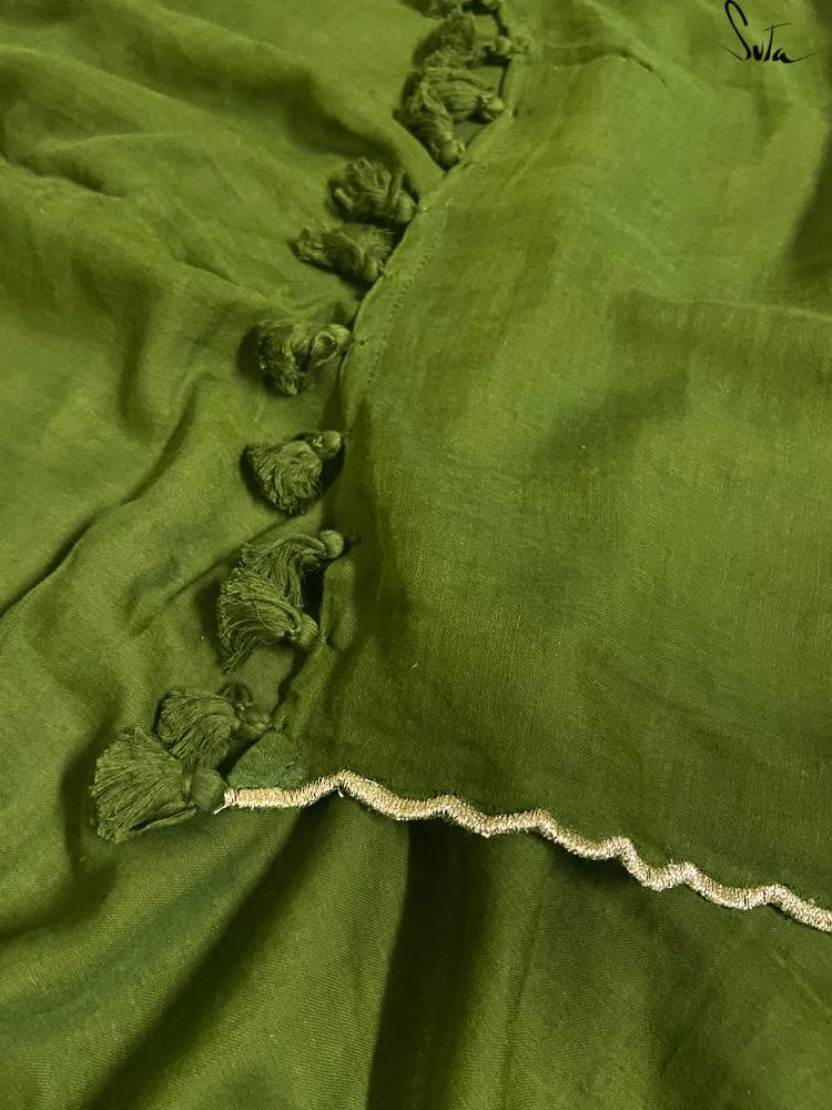 This is an olive green made-in-heaven mul saree with gorgeous machine-embroidered scallops on the border.