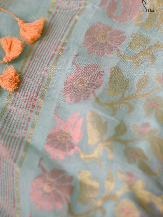This saree is made of a gorgeous fabric that is a blend of cotton and polyester, hand-woven on a Jacquard handloom. Here, a set of punch-cards are attached to handlooms to sort the weaving patterns. This makes it easier and faster for weavers to weave the fabric to life. The saree is fluid, soft, falls amazingly well and embodies the charms of handloom fabrics.