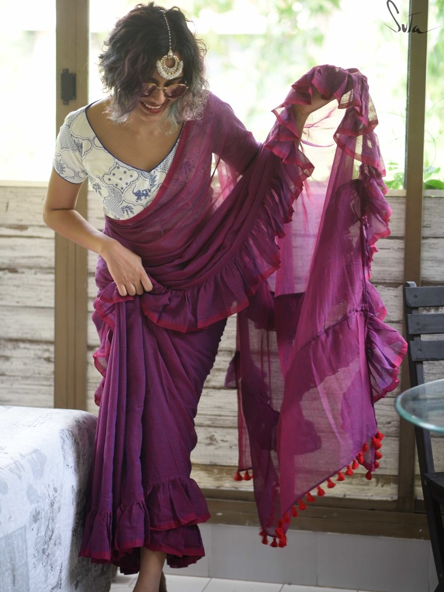 Ruffles are the perfect addition to the incredibly soft and light made-in-heaven Mul fabric. These pretty ruffle sarees are an amazing addition to your wardrobe because they offer the perfect mix of elegance and spunk.