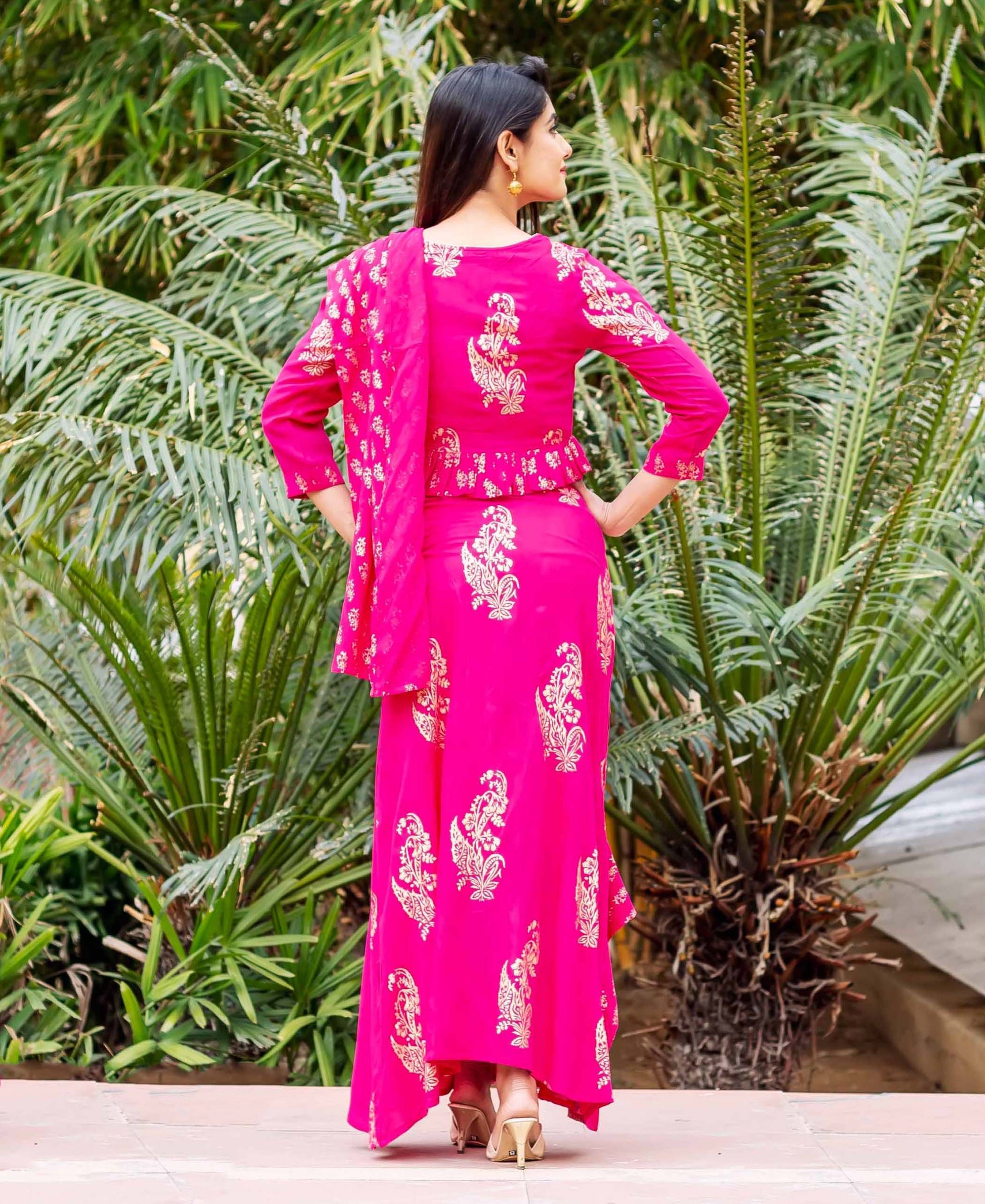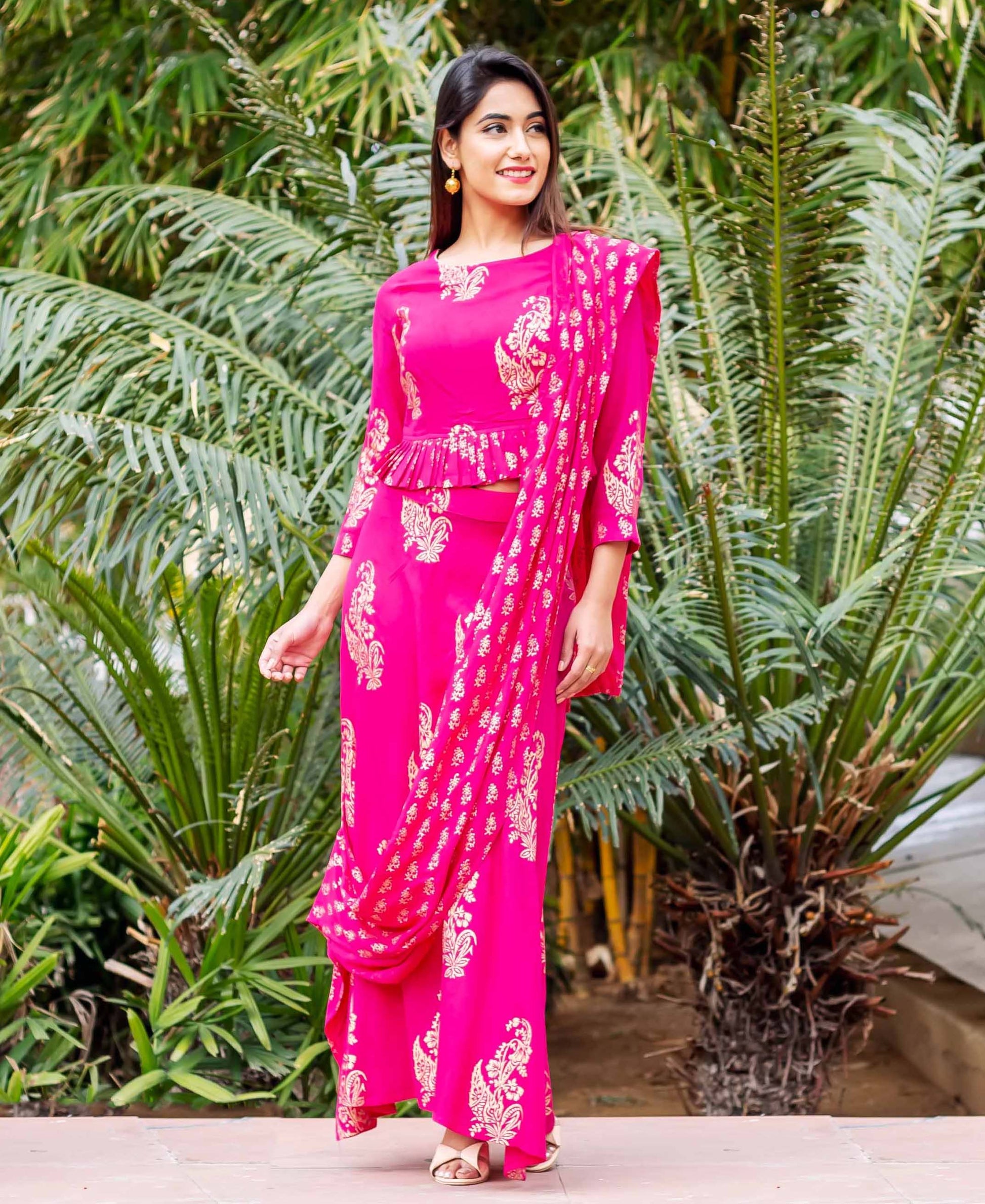 Fuchsia and Gold Printed Top with Saree Skirt