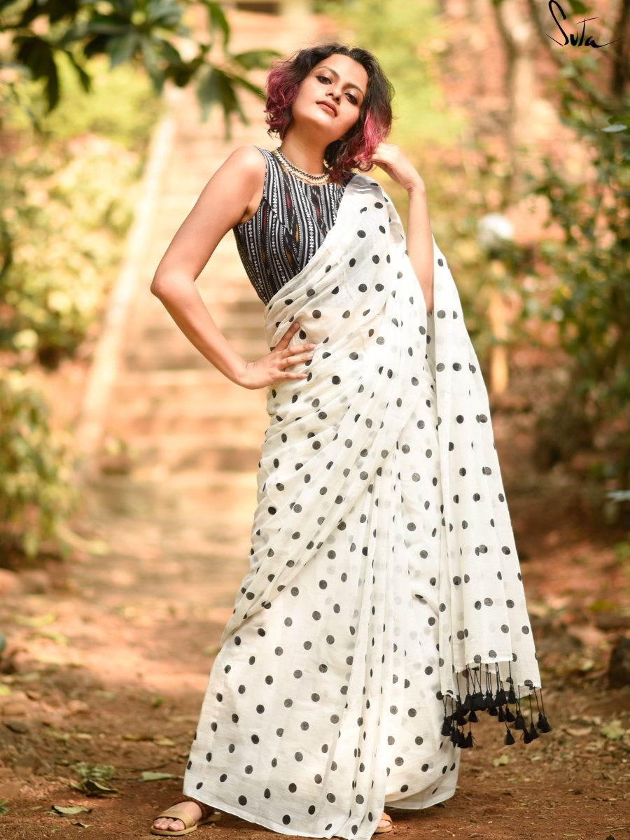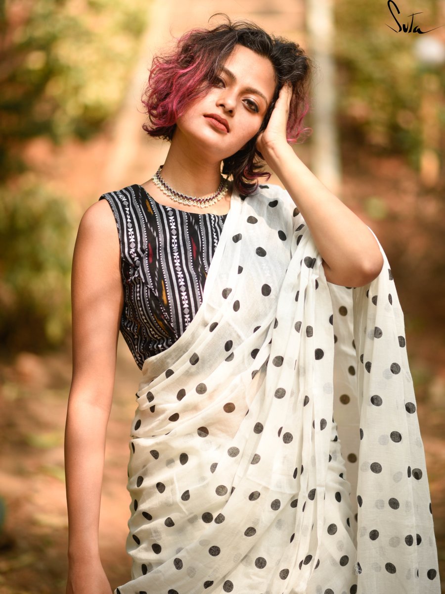 This made in heaven mul saree in black and white is a screen-printed beauty that you just can’t miss!