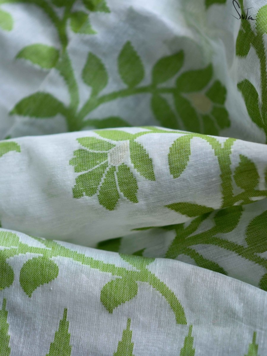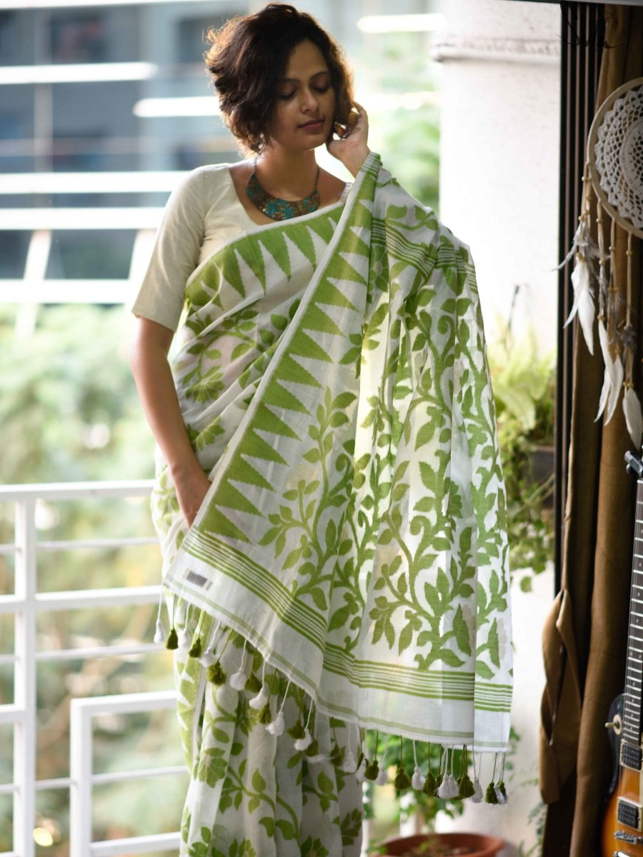 This beauty in green and white gives out a certain tranquillity that is a rare find in sarees. This Jamdani drape belongs in your collection!