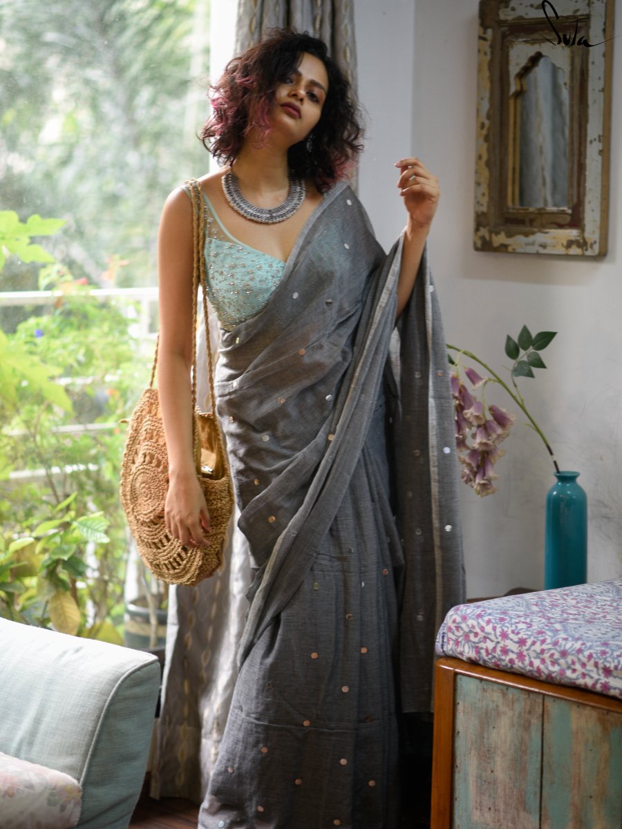 This made-in-heaven mul saree in grey with glitters is irresistible!
