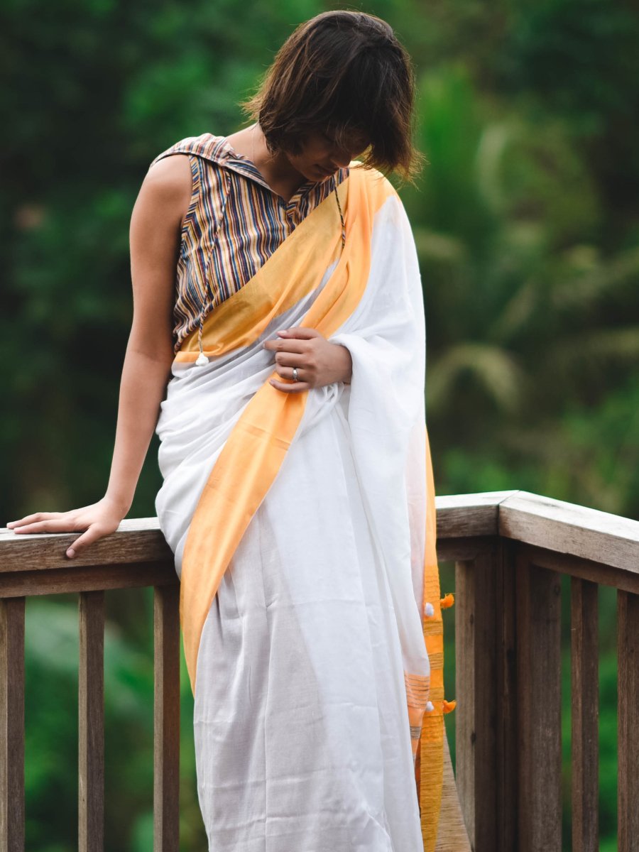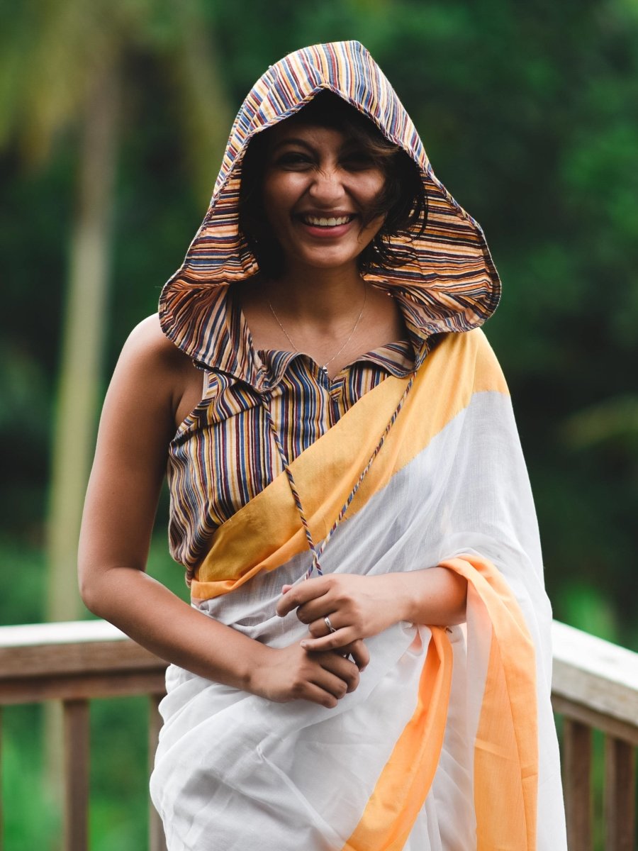 Goldfinches and doves- When theres jute in it, we love it.Light, colourful and handsome drape. Handmade saree with splash of colours that stole our hearts and is all set to steal more. This one comes with a red blouse piece, but we would suggets you to straightaway go for a raw jute or tussar fabric and make a blouse with 11 inches sleeves. Go Party, girl!. 6.5 meters of love