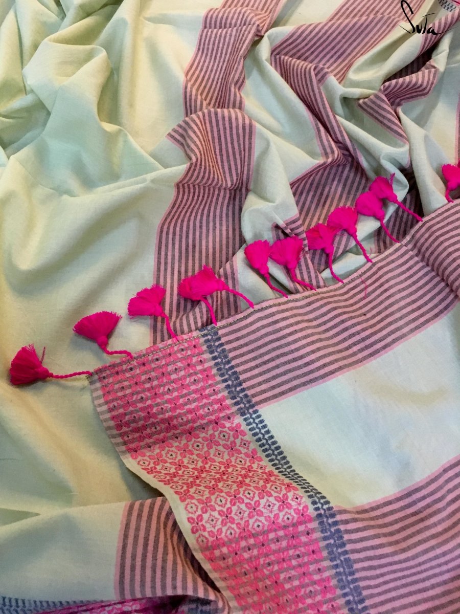 The handloom cotton is a type of fabric that is woven using hand operated looms. Two sets of interlacing yarns, the warp (length) and weft (width), are woven on a mechanised loom operated by weavers. These looms do not use electricity. Human handling lends the fabrics a unique feel and renders the fabrics more value. The resultant fabric is softer, more durable and much more comfortable than machine-made fabrics. Handloom cotton is more breathable and thus feels lighter in summers and provides more insulation in winters. The dyeing process also becomes easier for handloom cotton as the colour penetration is substantially more. Hues are absorbed better thus look resplendent on handloom cotton.