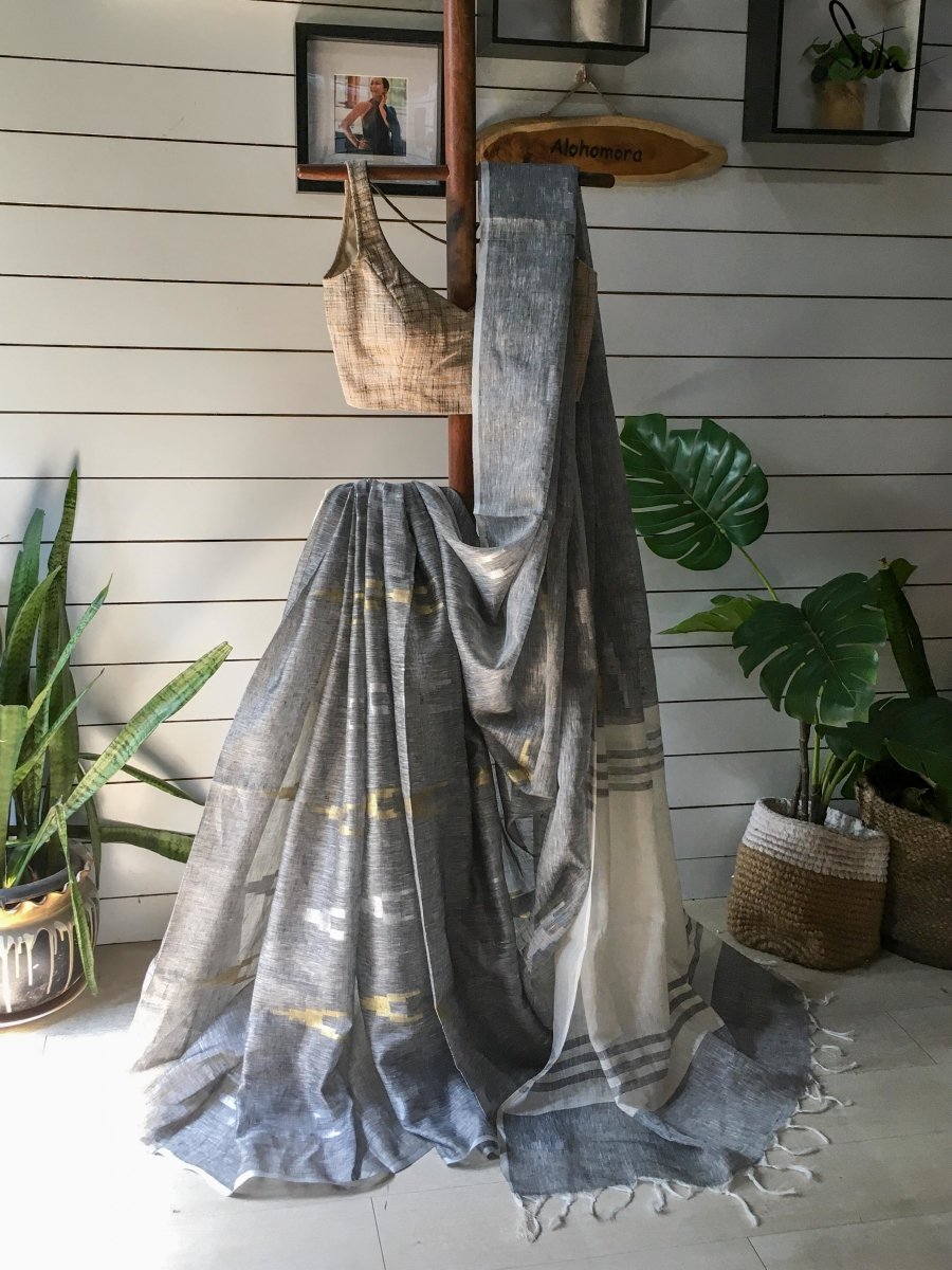 Linen is one of the oldest and most widely used fabrics thanks to its versatility. Particularly in countries that experience hot summers for a large part of the year, Linen exists more as a soft summer breeze that just happens to cover up their body as clothing! It feels oh-so-comfortable to the skin while appearing crisp and sturdy even in humid conditions. However, it is not a bed of roses to make a Linen saree. The stunning Linen saree come from pretty hardcore and labour-intensive procedures. Flax is grown (it takes around 100 days to cultivate) and its fibre is separated before it is woven into fabric. Each of these processes involves manual labour and extensive physical work. The separation of flax fibres involves a process called retting and the weaving is done with specific counts as per requirements. The earliest Linen in Egypt is said to have had a thread count of 450 to an inch, which is finer than anything woven today! In a world of factory produced fully machine made fabrics, the Linen stands stubbornly demanding the involvement of workers. So, the Linen that reaches you is a story of these heroes who pack in that extra little bit of love along with their amazing work.