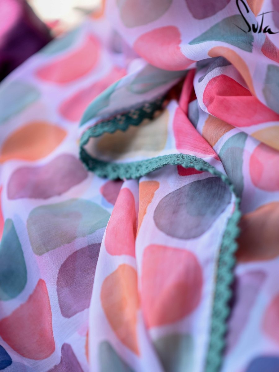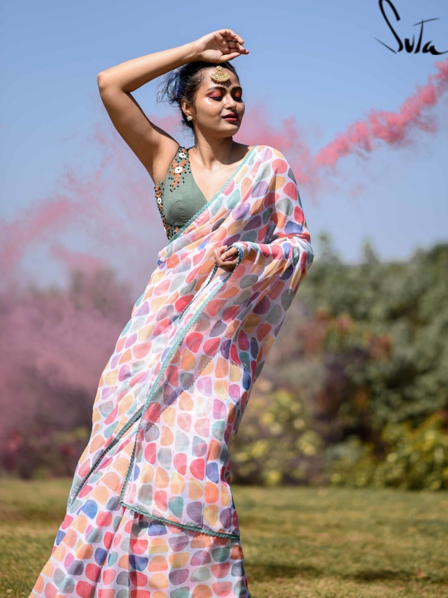 The sarees in this collection come alive with colours as the spirit of Holi takes over. The designs are inspired by the different beautiful elements that this festival is associated with. From pretty bubbles, splashes of colour to the riot of rainbows, the designs exude a fun, bright, lively vibe that will lift you up and dance with you as you let the child in you break free! Digital printing is used to print the designs on poly-chiffon fabric and this new-age method brings the charm of prints and the convenience of technology together. In this method, designs from a computer or any electronic device are directly printed onto the fabric. Digital printing is considered to be a major evolution in printing methods and has opened up varied design possibilities with it. The delicate lace on the border of the sarees add just that touch of charm that you can resist!