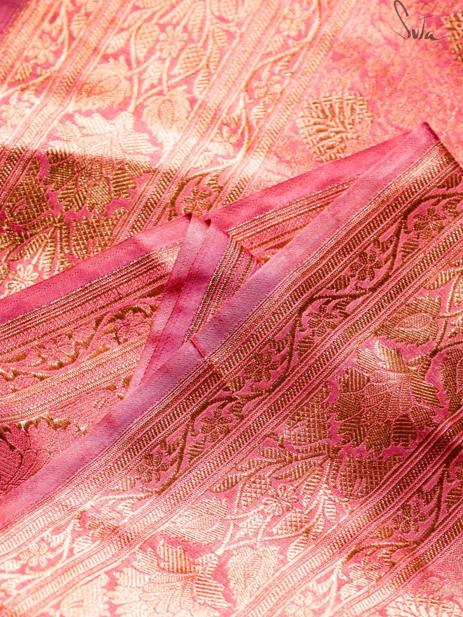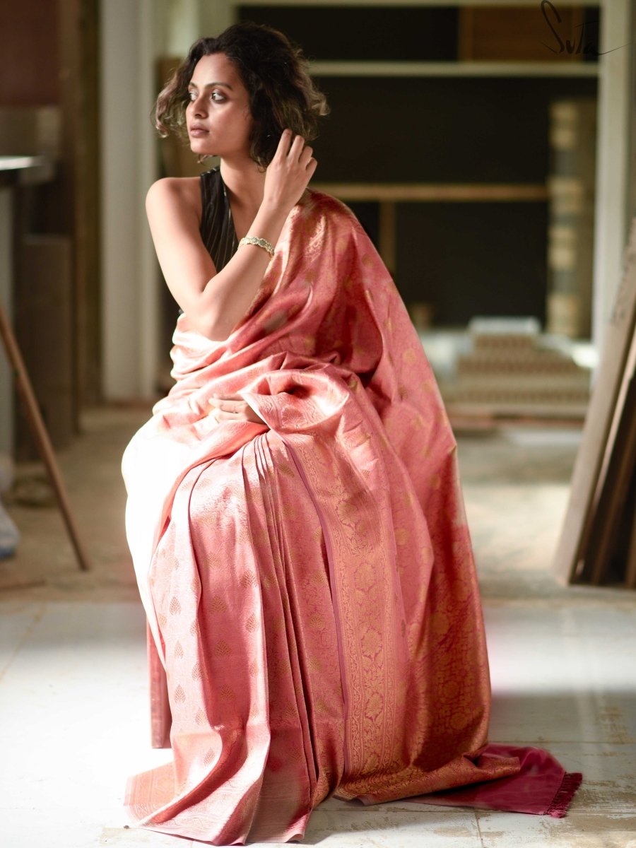 Rose water is an integral part of Indian households and Banaras is known for its amazingly aromatic gulab jal. Walking through the streets of Banaras, you will find a lot many shops selling authentic fragrances and perfumes and the most captivating of them all is the rose essence. It is a fragrance that is synonymous with Banaras and is used in food, skin care, rituals and the list is just endless. The fragrance lets you lose yourself in its sweetness and this saree is a dedication to that!