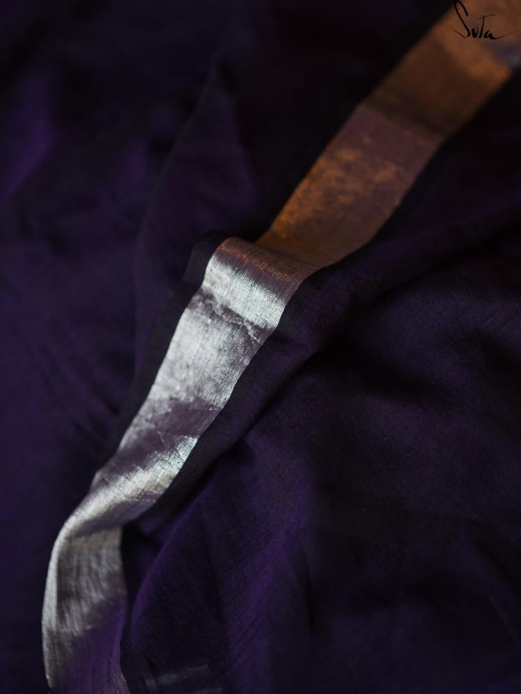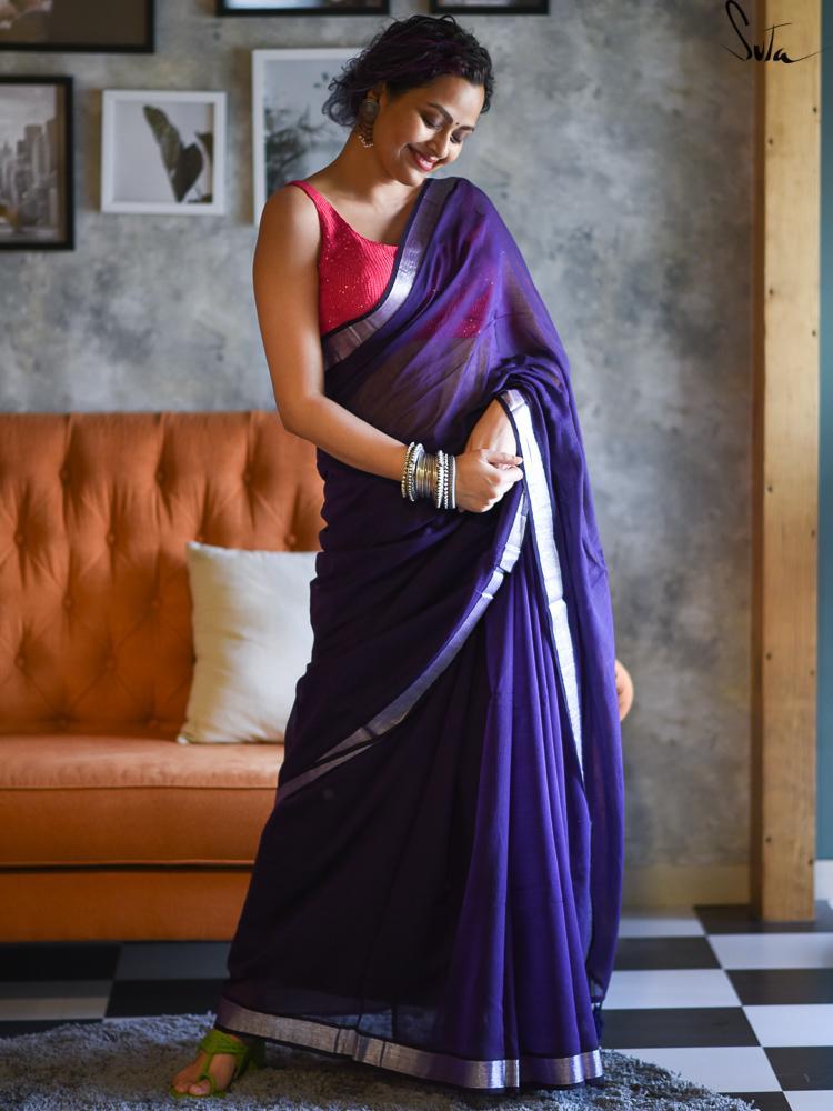 This is a violet-coloured handloom made-in-heaven mul cotton saree with zari in the border. And, it embraces all of you in its fluid, soft drape.