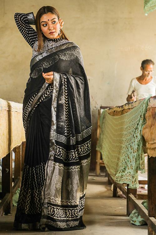 Enjoy ancient alchemy in this collection of fabric dipped in patri i.e. copper sulphate solution and hand block printed with chuna i.e. lime solution to make unique designs in black and white. It’s a Slub Cotton 5.5 mtr saree drape with exclusive 80 cm blouse piece to go with.