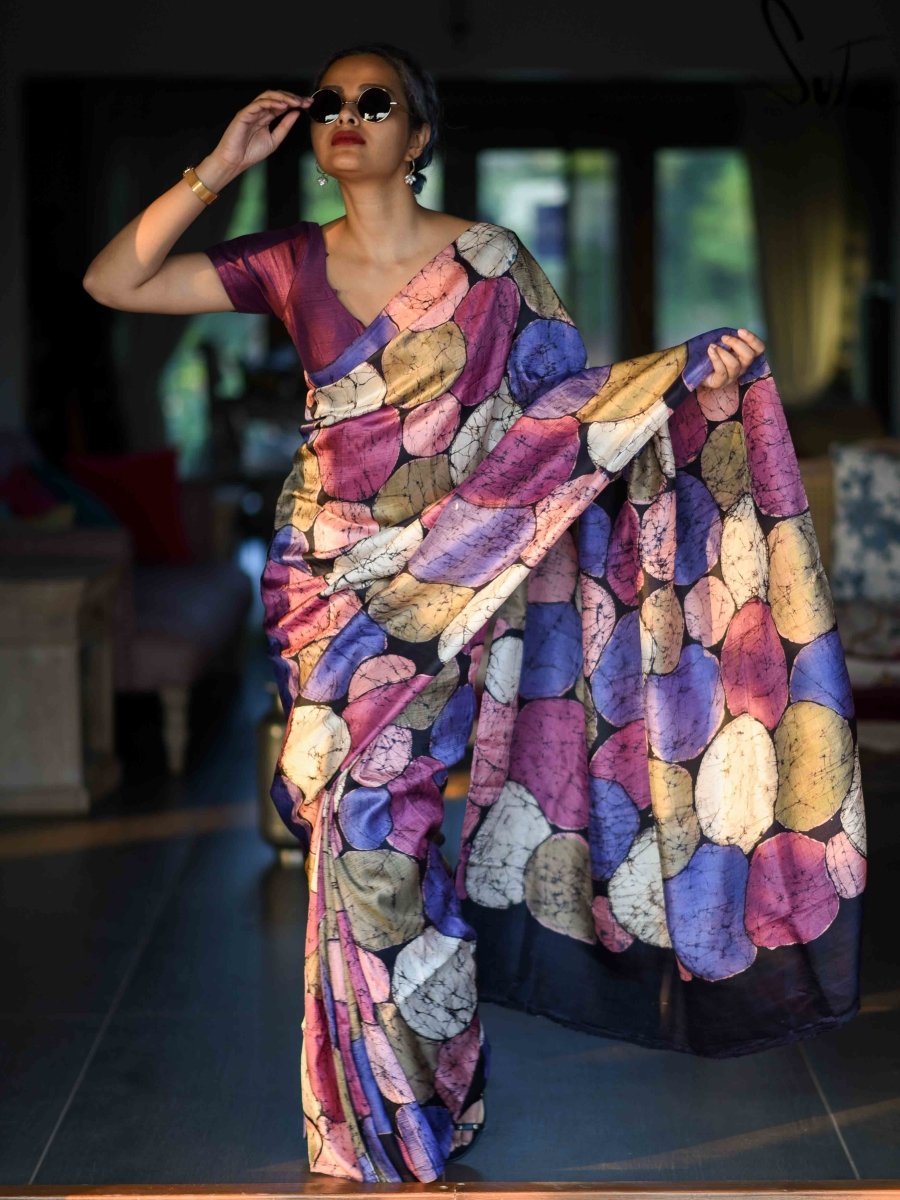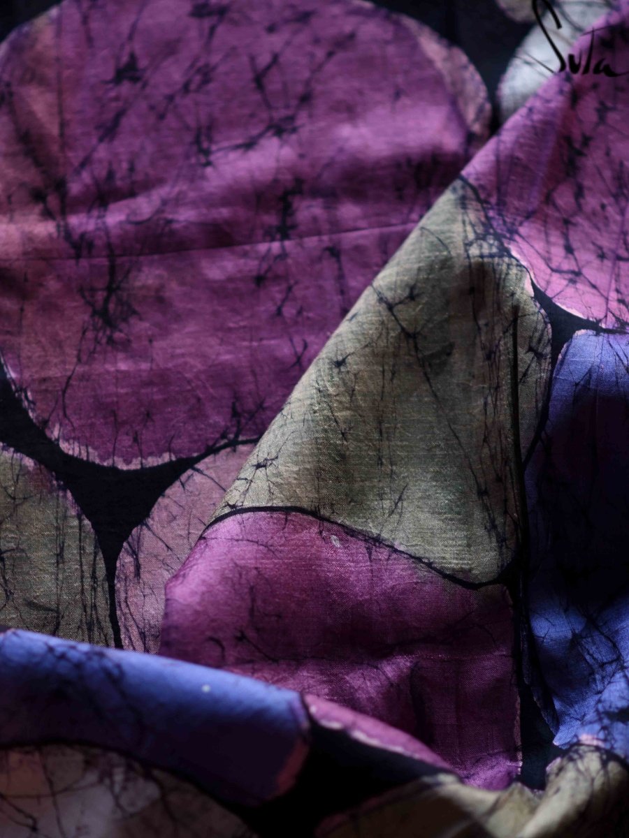 The ancient craft of wax-resist dyeing called Batik adds a timeless charm to this saree. Wax-resist dyeing has been a part of so many ancient civilisations across the world and can be uniquely characterised by the local motifs and designs used. Specifically in India, Batik is said to have over 2000 years of history. Materials such as wax or rice starch was used to create the resistance to dye and thus create the Batik designs. The entire process involves various steps such as drawing the basic pattern, redrawing using wax and then applying the dye.Then, the wax is removed after the fabric dries. This is done multiple times to create various patterns with different colours.The process of dyeing is something that has been passed down by generations of artisans and the stunning designs created by these master craftsmen are timeless.