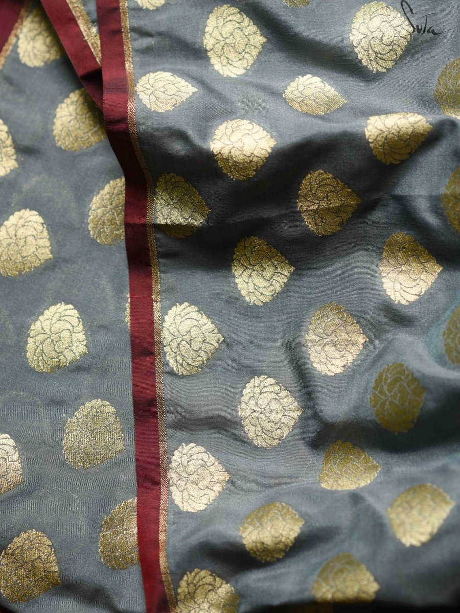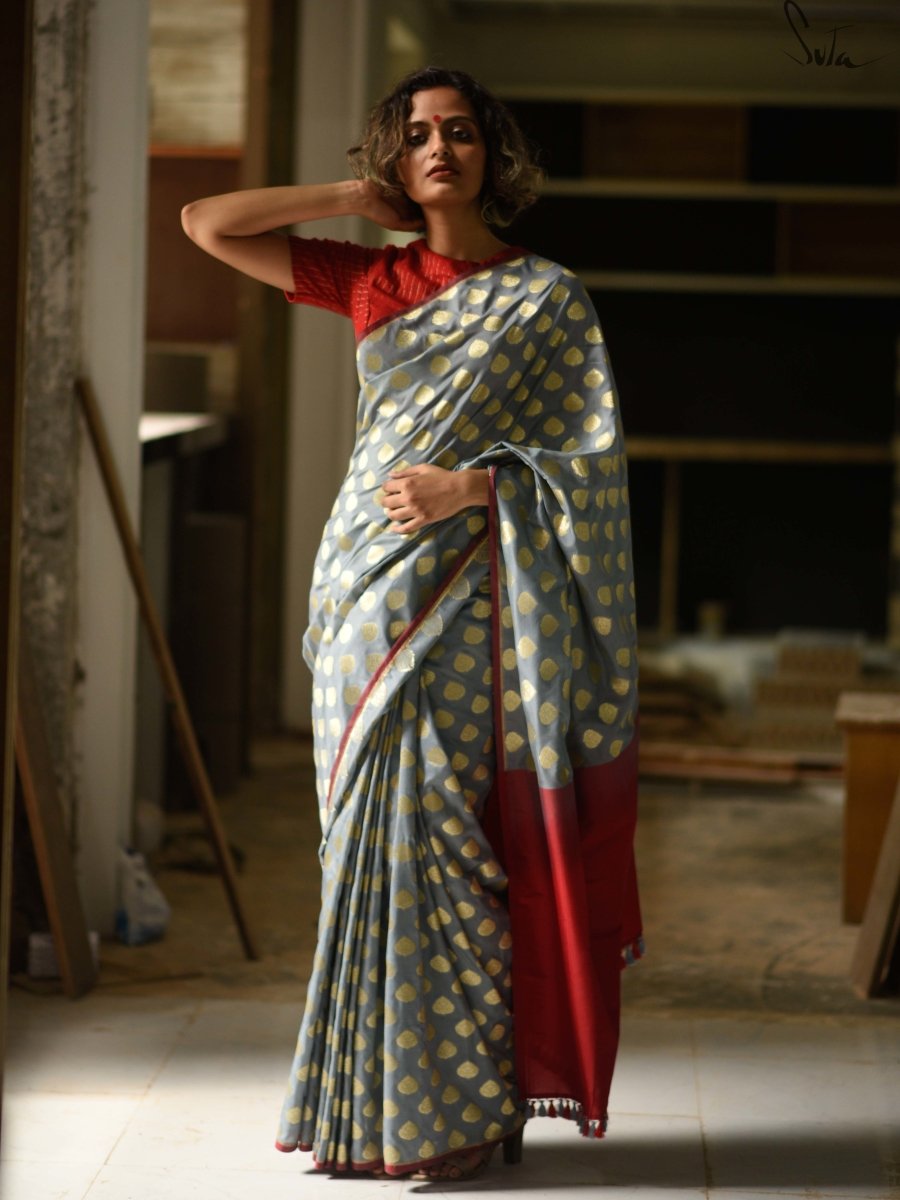 Banaras is a sensorial experience; it touches and teases one’s senses at so many points and levels. There are so many colors, so many sounds and mouth-watering smells. One such smell is that of deep fried delicacies, filled with masaledar stuffing, bathing in glistening oil. The smell is so strong that it literally gives you wings and makes you fly towards those stalls filled with the grey from all the frying and reds from all the chilly! This saree is a take on these unique colours.