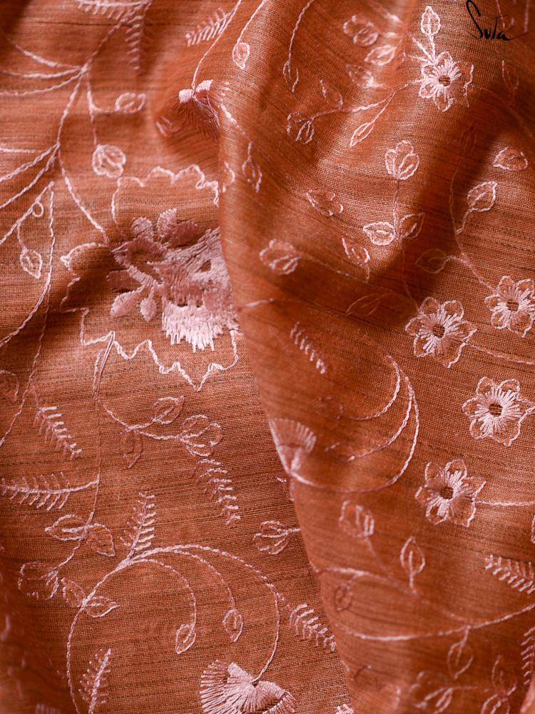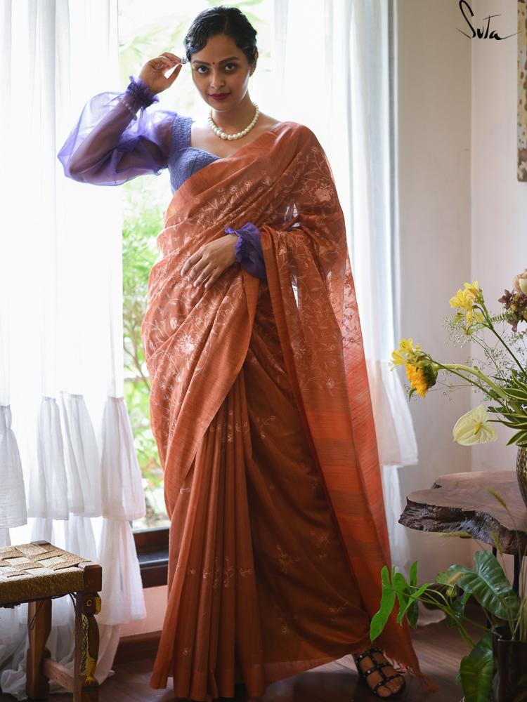 This is an orange coloured saree in poly nylon that comes alive with the delicate machine-embroidered floral designs!