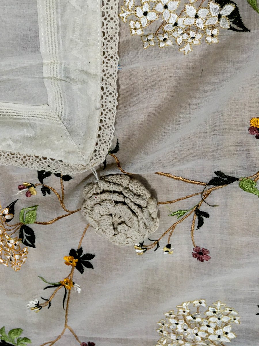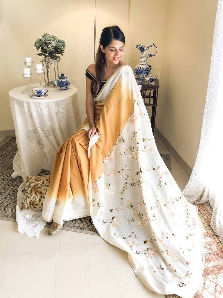 This cotton saree in off-white and mustard with embroidery is simply beautiful!
