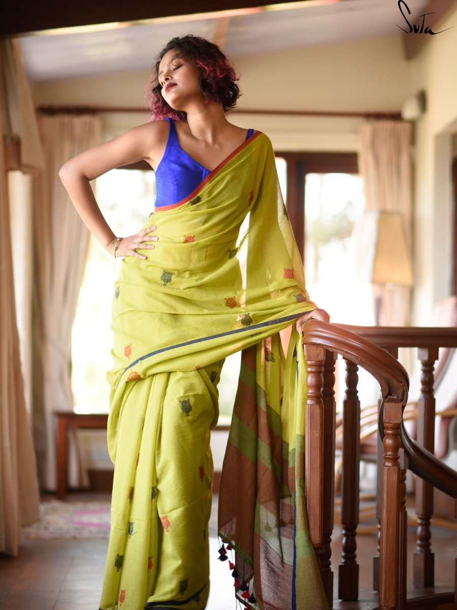 This collection is an exploration of some of our favourite animals and the traits that we humans share with them. The mystical connection that we share with these animals is expressed through Origami inspired shapes that come alive on the soft fabric. The intricate weaving is done by master artisans in West Bengal and a single saree takes approximately 1.5 weeks to be hand-spun and hand-woven. In fact, the entire family of a weaver works to create every product and are involved in various steps of weaving. The magical collection is a result of our designer staying with the artisans for over 3 weeks to understand their world and create this contemporary take on handloom sarees.