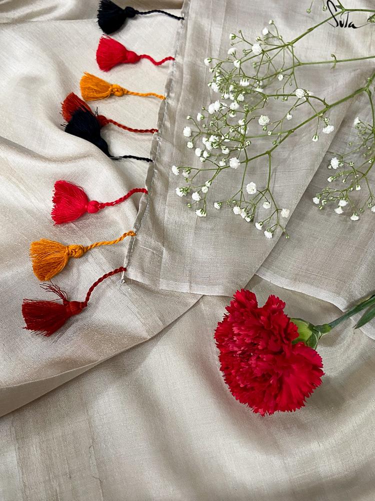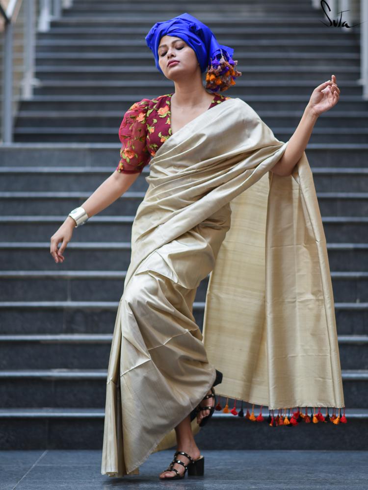 All the peaks of the reds of the skies, the brilliance of blues and the abyss of the deep black darkness dissolve into my ivory translucence. I give, I take, I go all out, I hold back, and every time there is an imbalance, I instinctively level the field. Why? Because I see that fairness is the bedrock of all that our lives, of all our skies co-existing. And, for fairness I will always root, for the rainbow in our collective skies to take root.This is a handloom silk saree in ivory cream colour. Its soft, silky, beautiful texture and the stunning colour steal the show!
