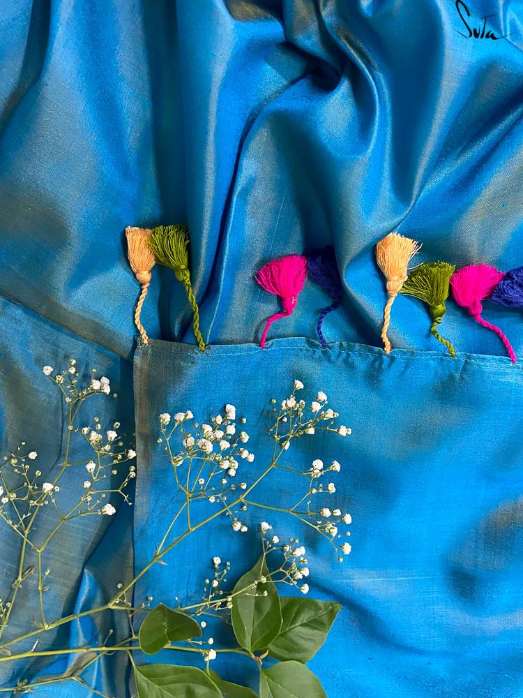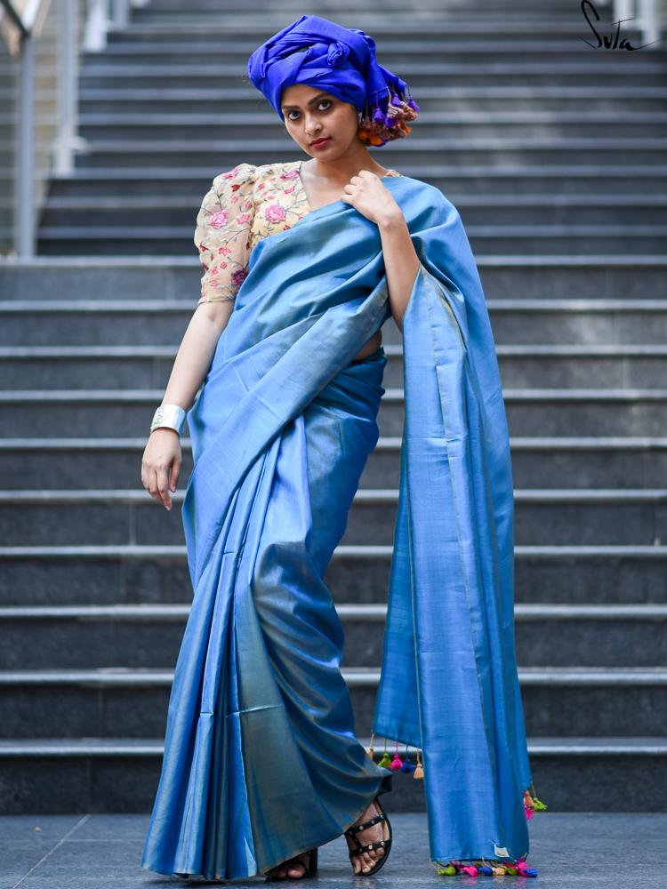 This is a handloom silk saree in blue and mustard dhoop chaon colour. Its soft, silky, beautiful texture and the stunning colour steal the show!
