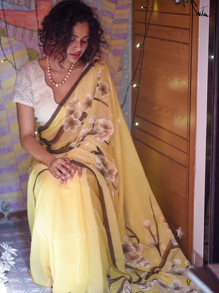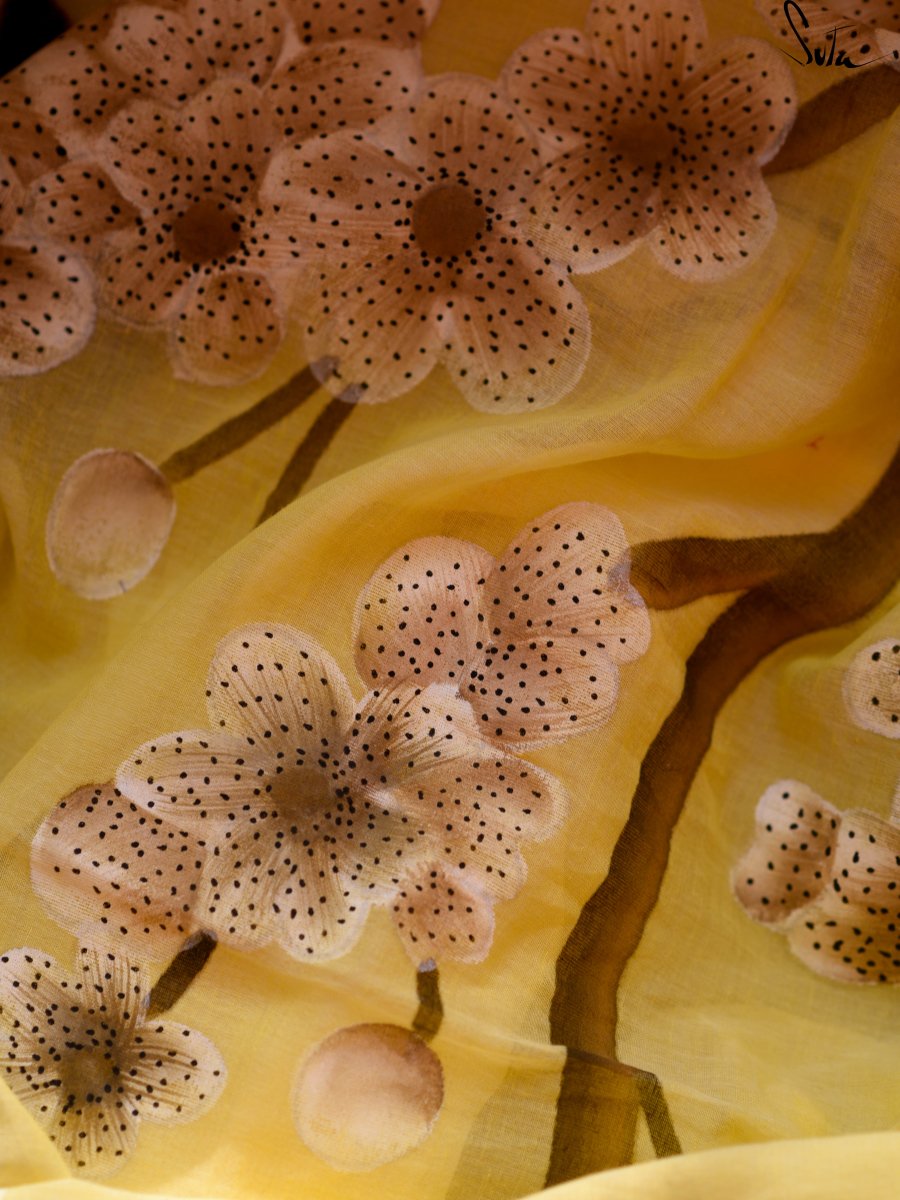 Our artists paint with all their hearts to create the hand-painted sarees. First, the painting is created with a pencil and water colours and once it is finalised, it is made on a live-sized paper and sent to artisans in villages. These artisans keep this as a reference and paint the final painting on the fabric in a free-hand technique. The softest Mul fabric becomes the perfect canvas for this art and these sarees make a statement like no other. There are bound to be some irregularities here and there and no two products will look absolutely the same. This is the beautiful allure of hand-painted art.