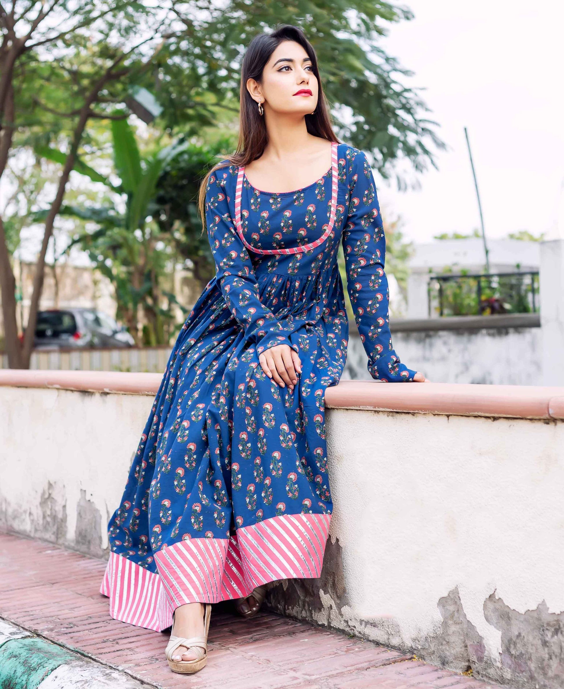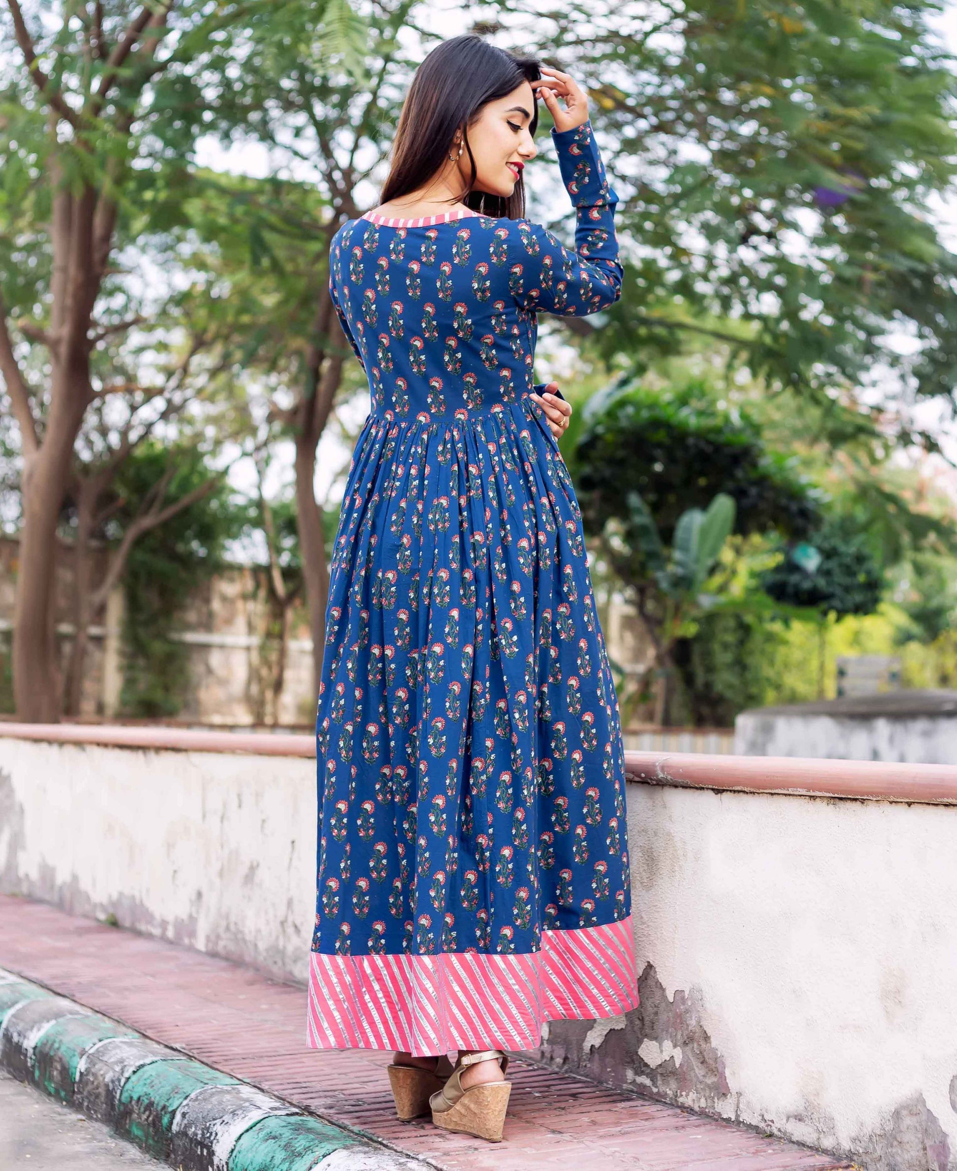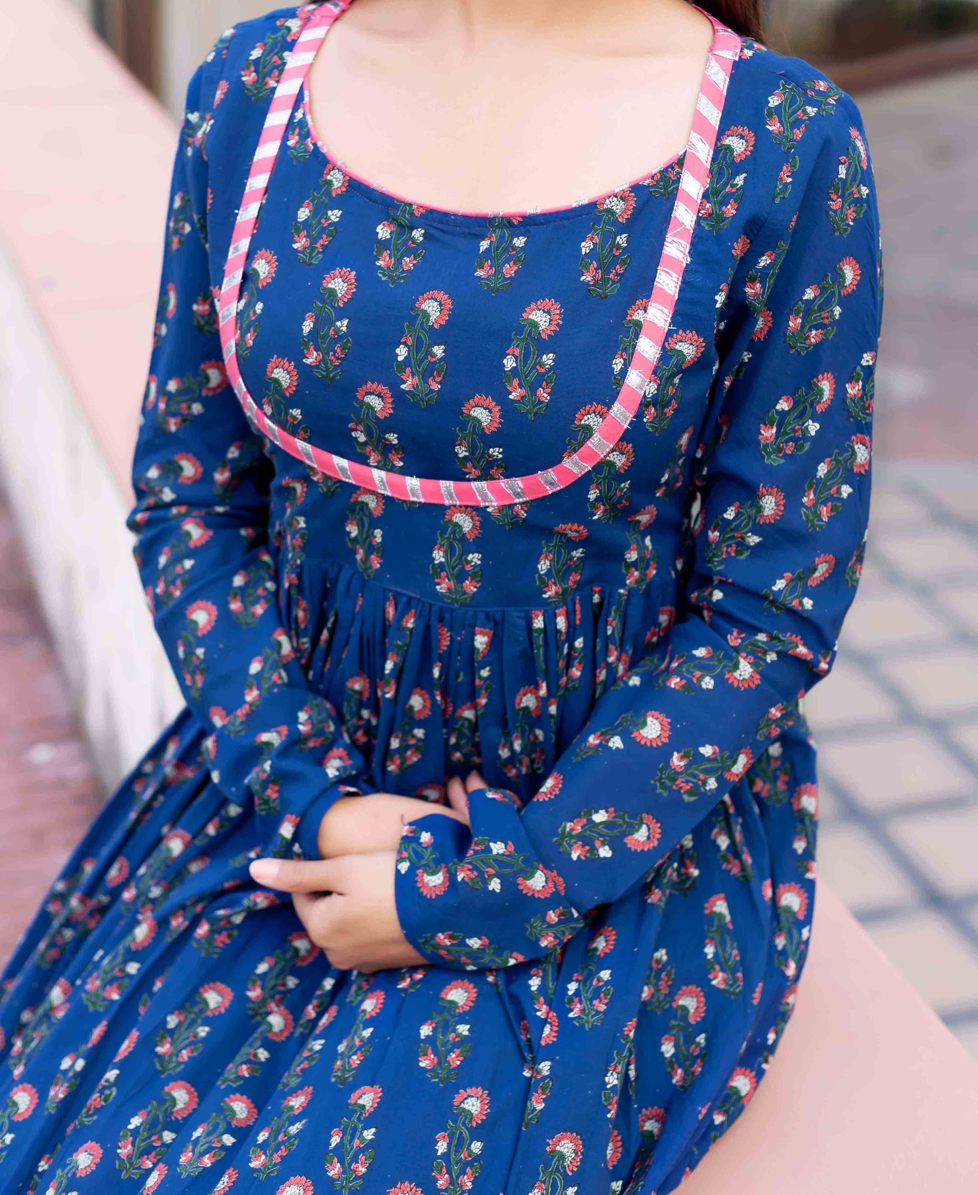 Indigo and Pink Long Flared Dress with Churidaar Sleeves