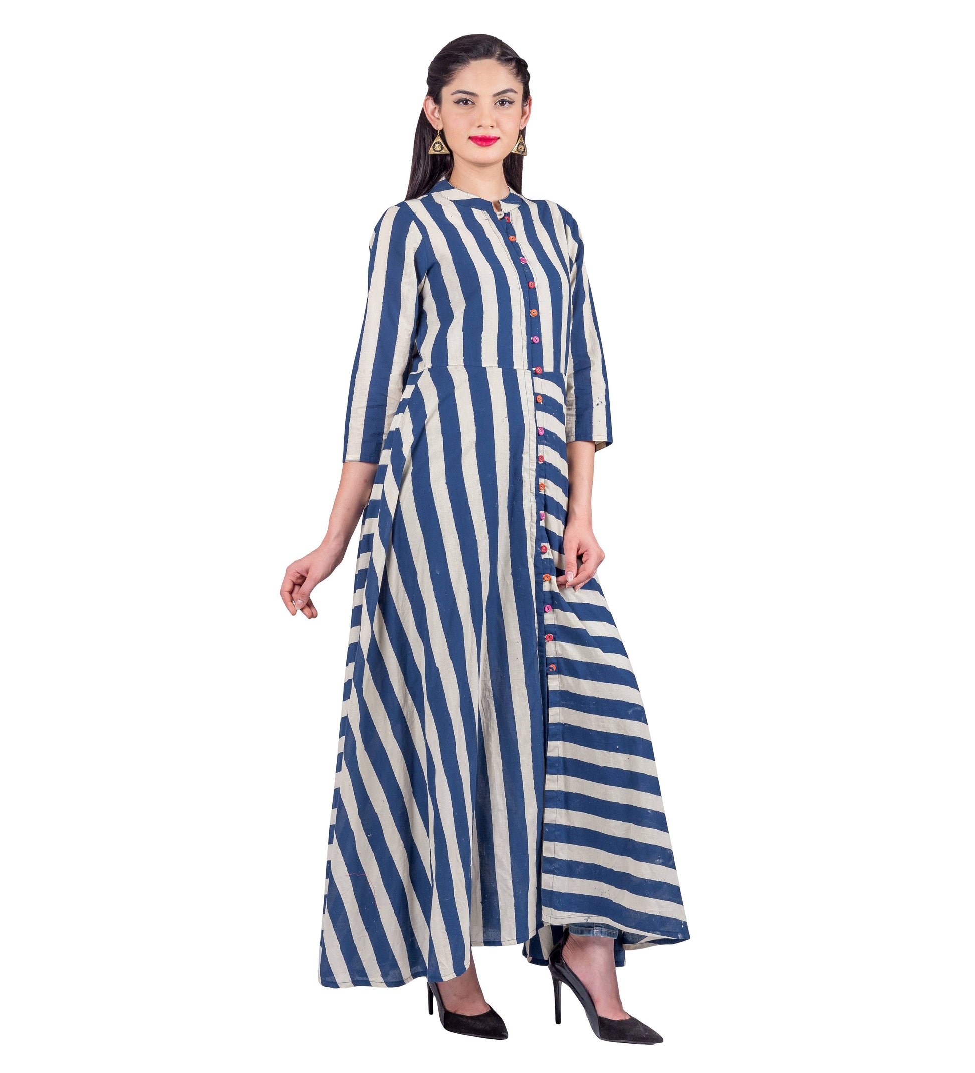 There is a rich feel to the colorful texture and tone of indigo mixed with bright white stripes. Make an endearing statement that makes your presence get an instant recognition. Step out with sweet resonance and class of floor length fit and the perfect stripes that present in different way. Let your wardrobe astound and impress!!