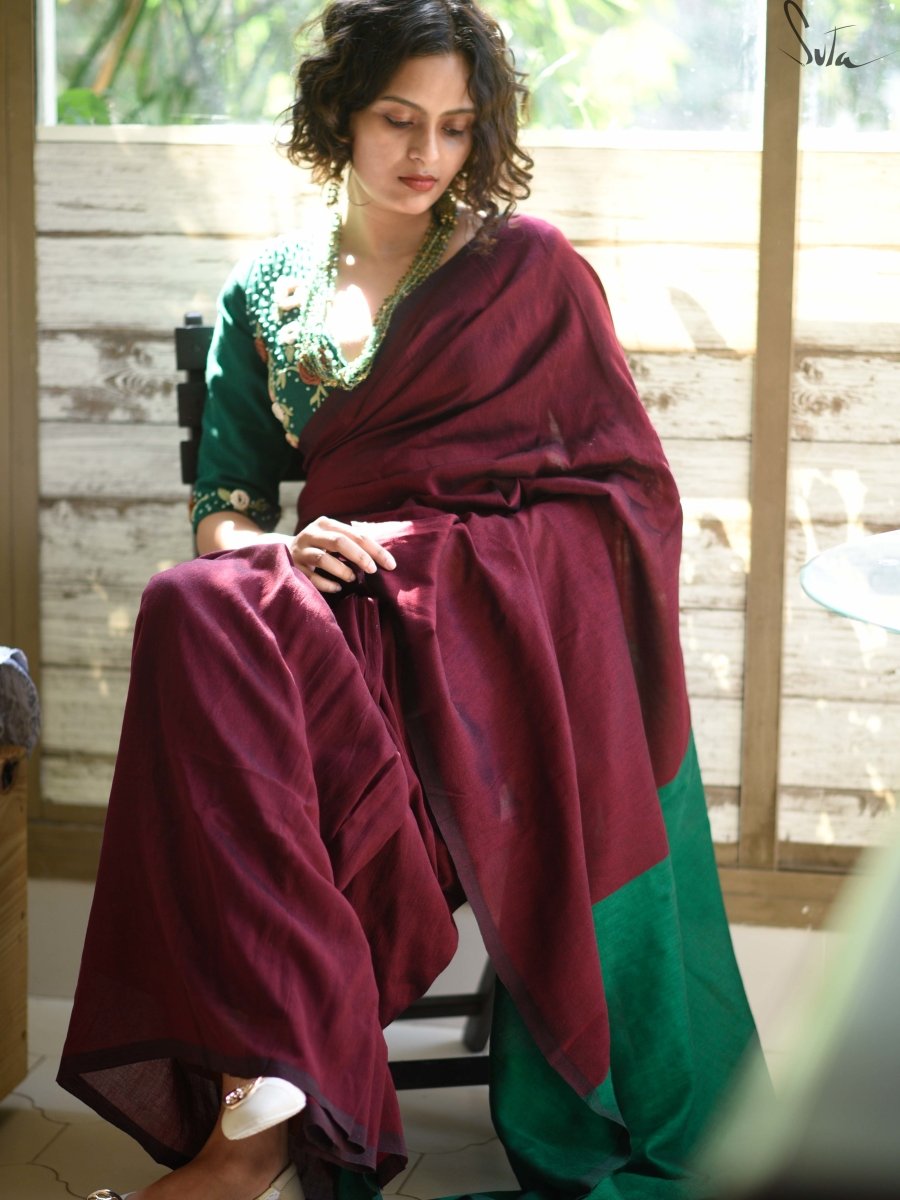 This beauty in maroon and green has a magical lustre that can instantly mesmerize you!