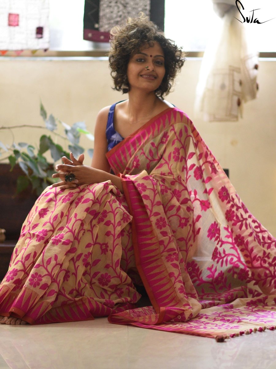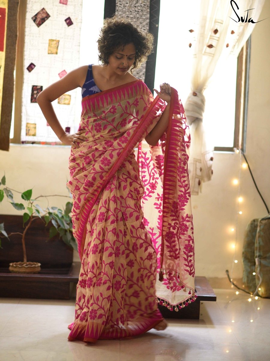 Beige and hot pink and kumbhas- a very thin gold border or any jute border has always stolen our eyes. Very rarely has no border sarees has entered our collection. But this white is an absolute stunner and sure has stolen our hearts. Super light hand weave that can be worn anywhere , absolutely anywhere.