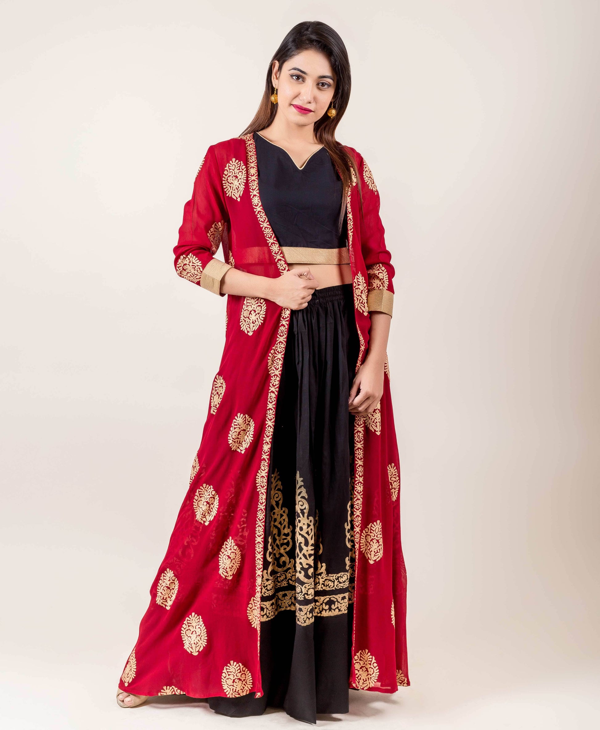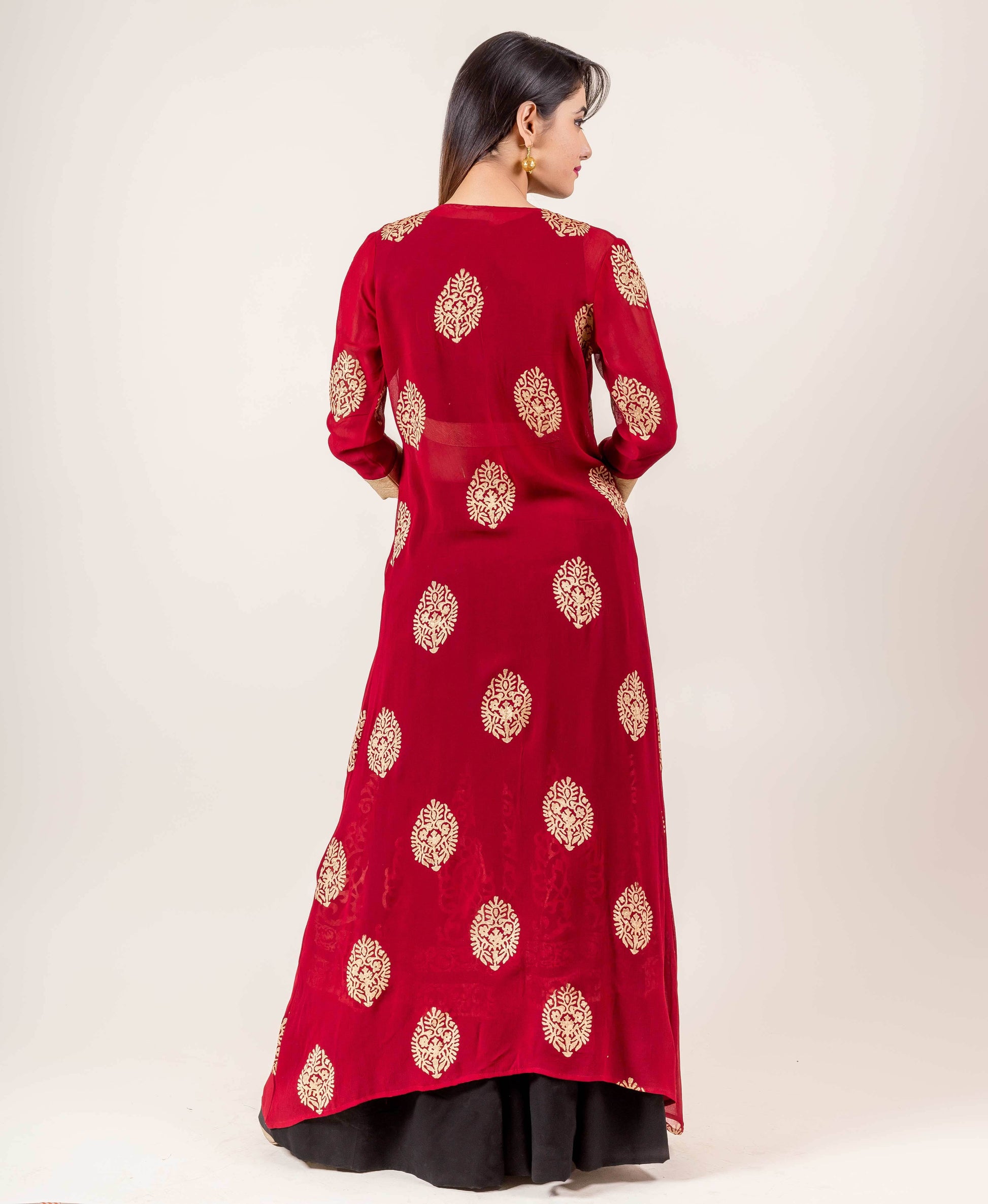 Jacket Style Indo Western Dress With Golden Prints In Red And Black Hues