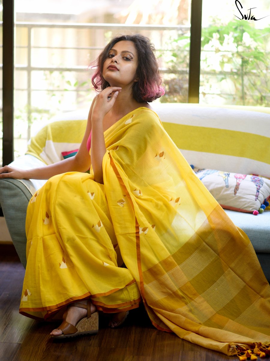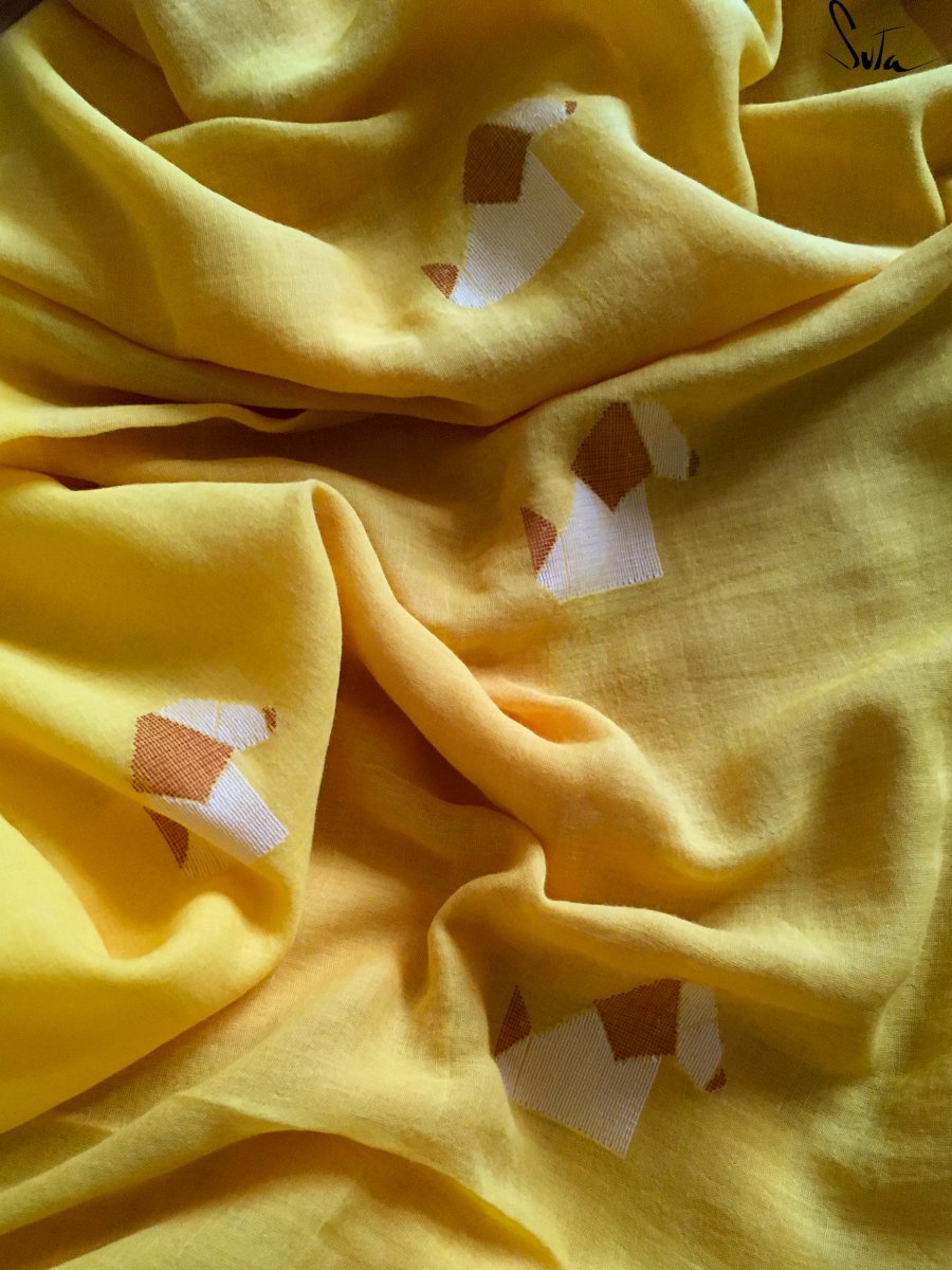 This collection is an exploration of some of our favourite animals and the traits that we humans share with them. The mystical connection that we share with these animals is expressed through Origami inspired shapes that come alive on the soft fabric. The intricate weaving is done by master artisans in West Bengal and a single saree takes approximately 1.5 weeks to be hand-spun and hand-woven. In fact, the entire family of a weaver works to create every product and are involved in various steps of weaving. The magical collection is a result of our designer staying with the artisans for over 3 weeks to understand their world and create this contemporary take on handloom sarees.